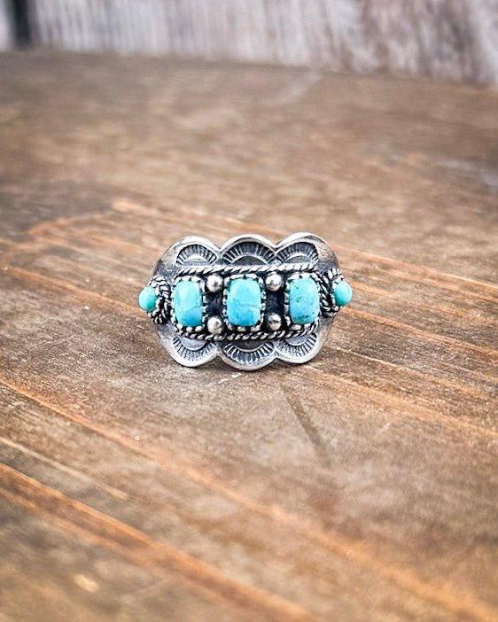 The Asia Turquoise Ring is bold, beautiful, and rooted in classic vintage style. With its wide, detailed band and row of genuine turquoise stones, this piece brings a strong statement energy while staying effortlessly wearable. It’s the kind of ring that looks like a one-of-a-kind antique find—but feels just right for everyday wear.