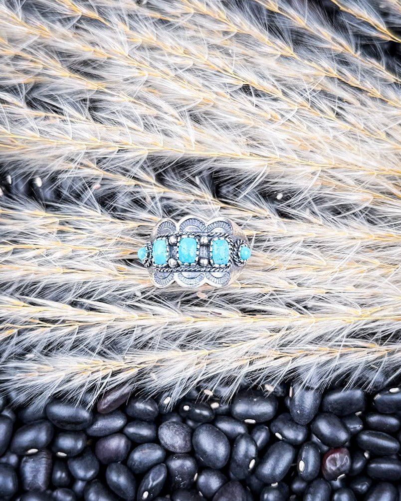 At the center, four genuine turquoise stones sit side-by-side, each bezel-set with a delicate rope border and framed by raised silverwork. The stones vary slightly in tone and veining, which adds to the authenticity and charm—no two rings are exactly alike. On each side of the band, an additional turquoise stone adds balance and symmetry, giving the design a well-rounded, finished feel.