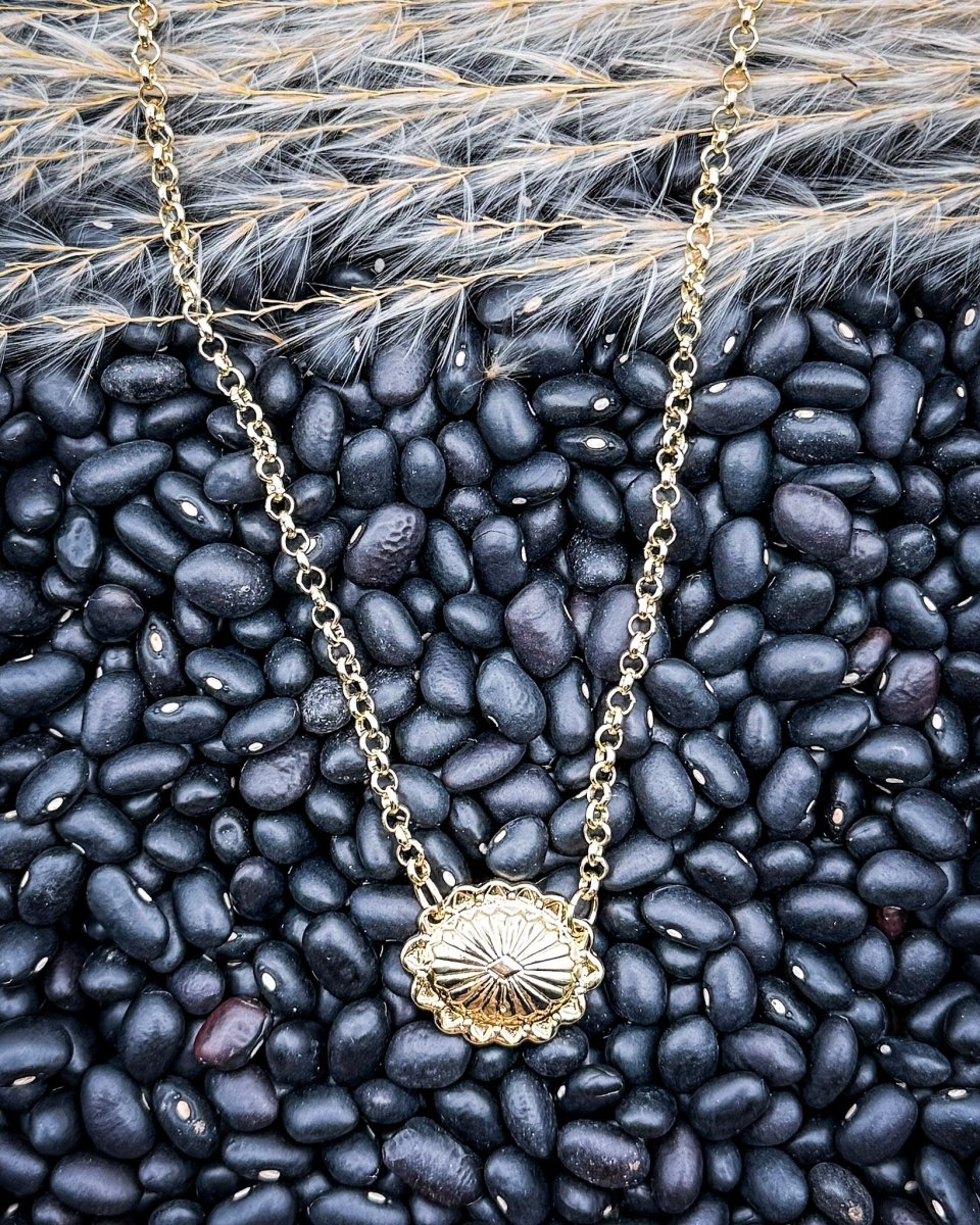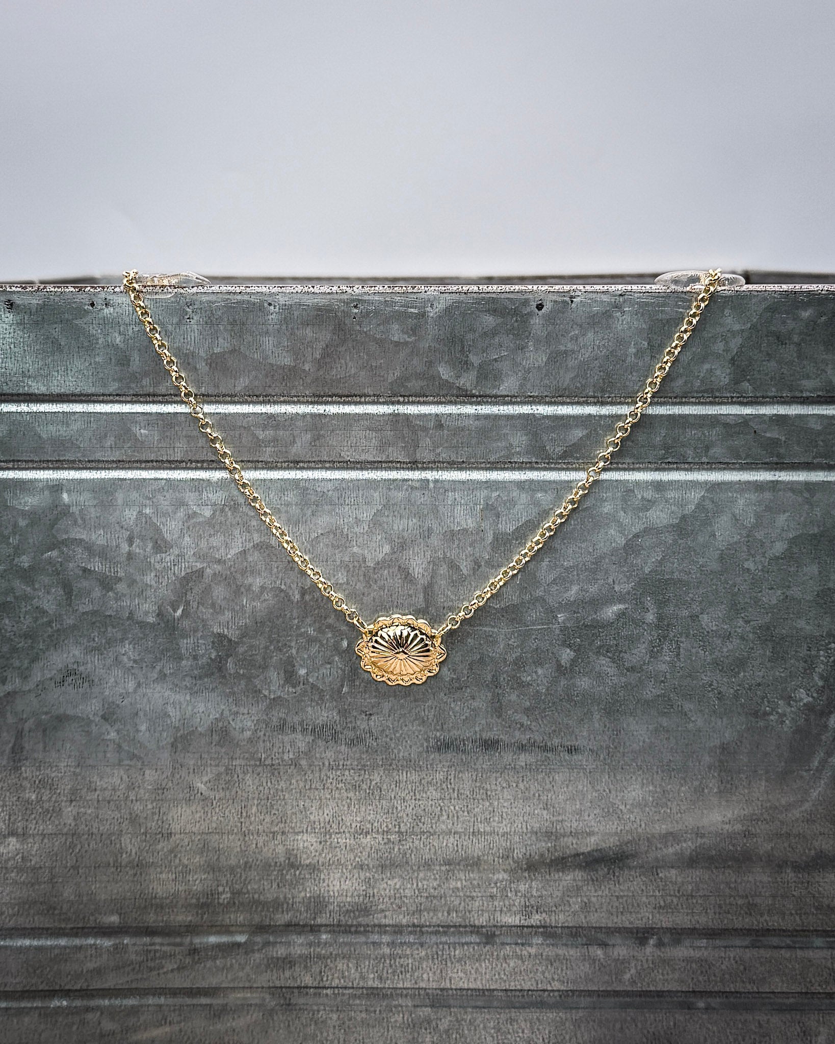 Aurelia Crest is a refined, minimal necklace that adds a quiet touch of polish to any look. This dainty piece features a 15 inch 18K gold plated chain finished with a small engraved concho style pendant that sits comfortably at the collarbone. The soft oval medallion catches the light with subtle texture, offering interest without feeling busy or overly themed. It is an easy piece to reach for when you want something simple that still feels intentional and put together.