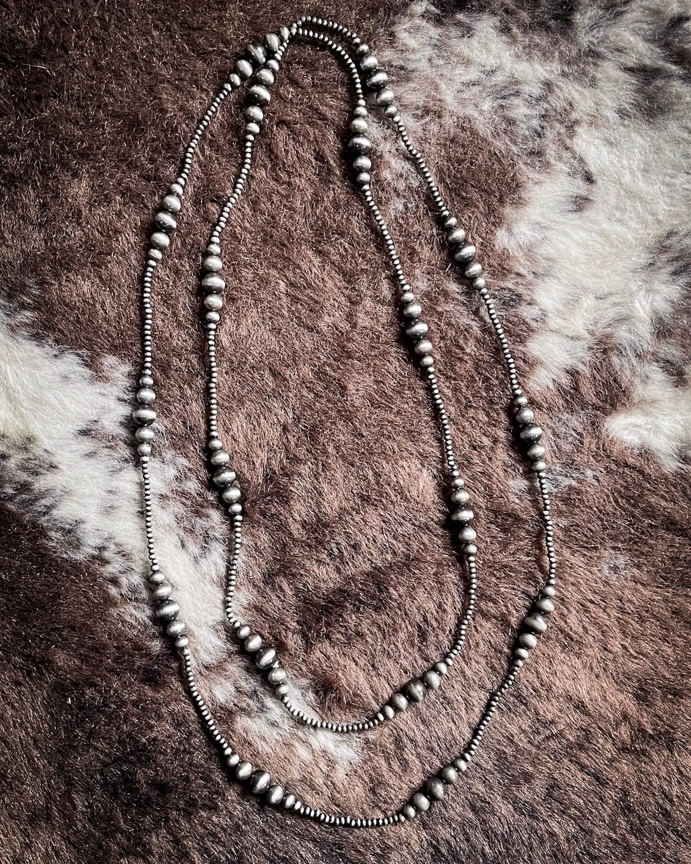 Introducing the Bunk Navajo Style Pearl Layer Necklace, a stunning graduated long necklace perfect for layering. Crafted in a burnished silver color, this 60" necklace with a 3" extender offers endless styling possibilities. Its versatile design makes it ideal for any outfit, whether worn alone or layered with other pieces. Elevate your accessory game with the Bunk Navajo Style Pearl Layer Necklace, a must-have for those who appreciate unique, elegant jewelry.