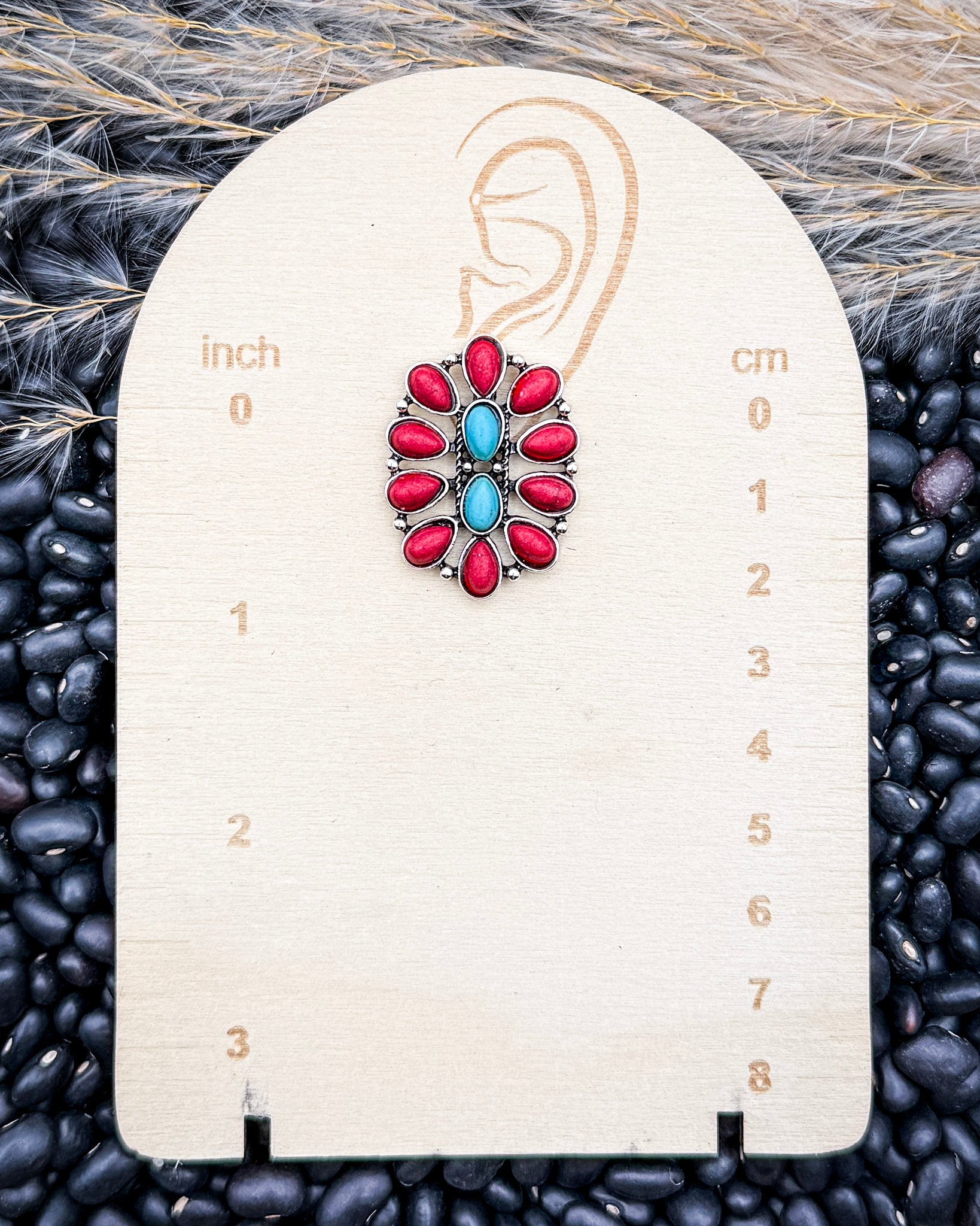 Crimson Vista brings a bright color story to your jewelry collection with a refined stud silhouette that still feels easy to wear every day. Each earring features a center turquoise style stone framed by a ring of rich red teardrop accents, all set in a softly burnished silver tone setting. The oval cluster shape creates a flattering pop of color on the lobe while the antique inspired metalwork keeps the look polished instead of overly bold. These are the kind of earrings that instantly wake up a simple tee, dress, or blazer without asking you to change your whole outfit.