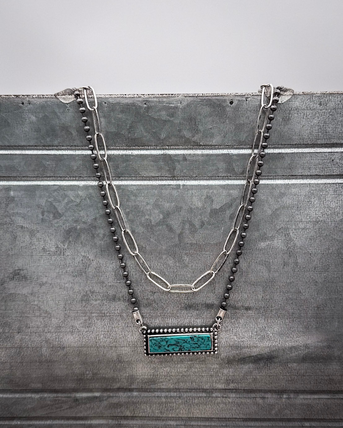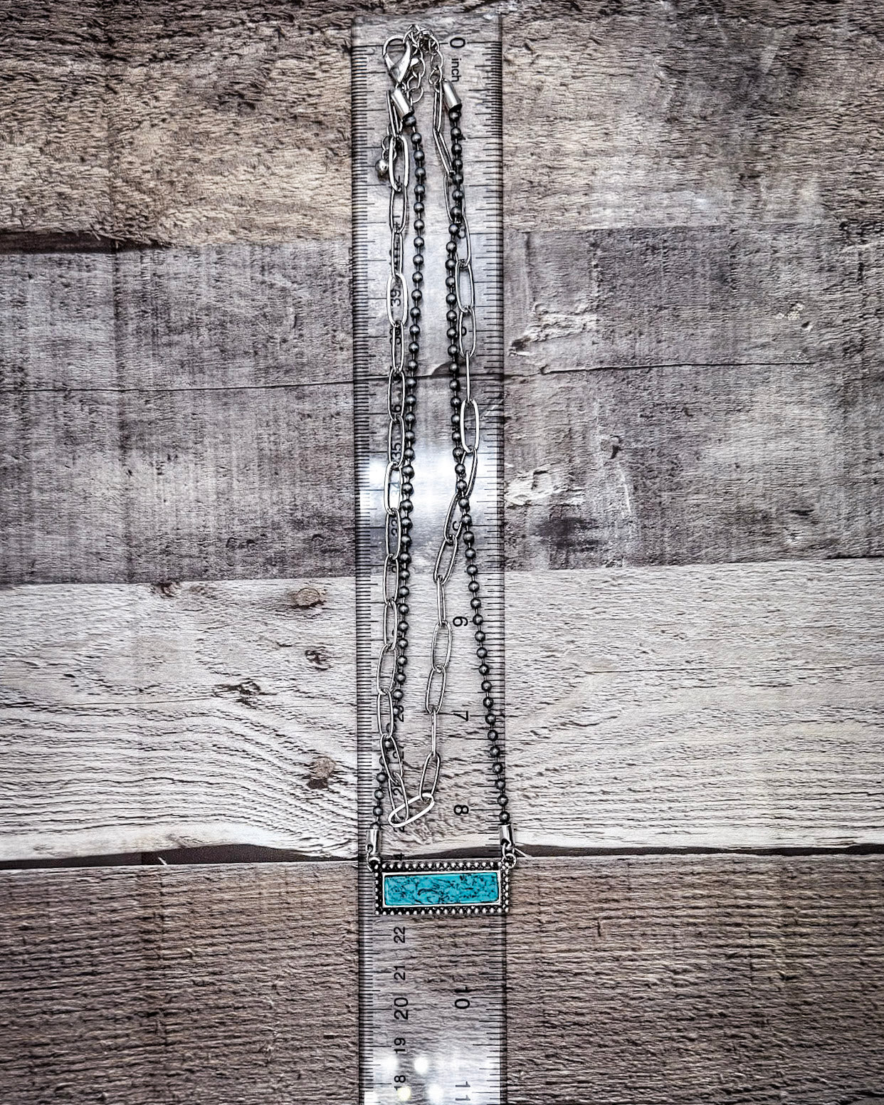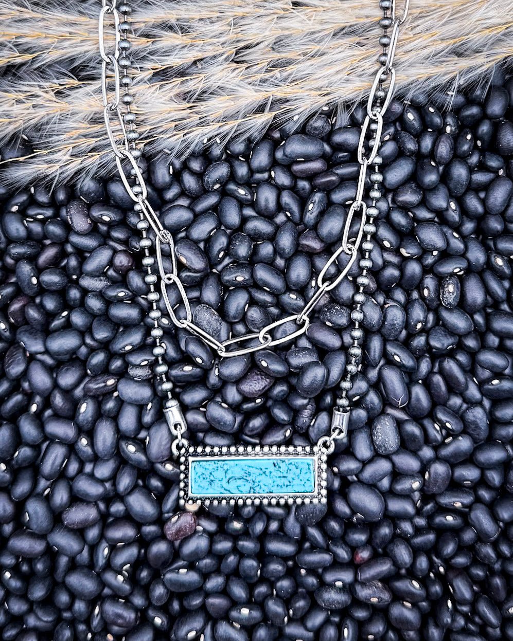 Channel the untamed beauty of the desert with the Desert Mirage Layered Fashion Necklace. Featuring dual layers of silver beading and chain links, this necklace showcases a bold rectangular faux turquoise pendant that instantly catches the eye. Whether you’re dressing up a graphic tee or adding a pop of color to your western chic outfit, this piece brings timeless southwestern charm and modern versatility together in perfect harmony.