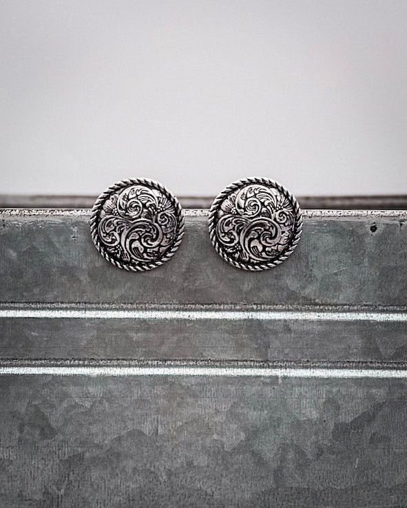 Embrace timeless western charm with the Ellie Western Rope Filigree Stud Earrings, a must-have accessory for any cowgirl's jewelry collection. These silver-tone concho studs feature intricate engraved floral scrollwork, bordered by a classic twisted rope edge that captures the elegance of traditional western design. Their subtle shine and vintage-inspired detail make them an effortless choice for everyday wear, whether you're heading out in denim and boots or dressing up for a night at the rodeo.