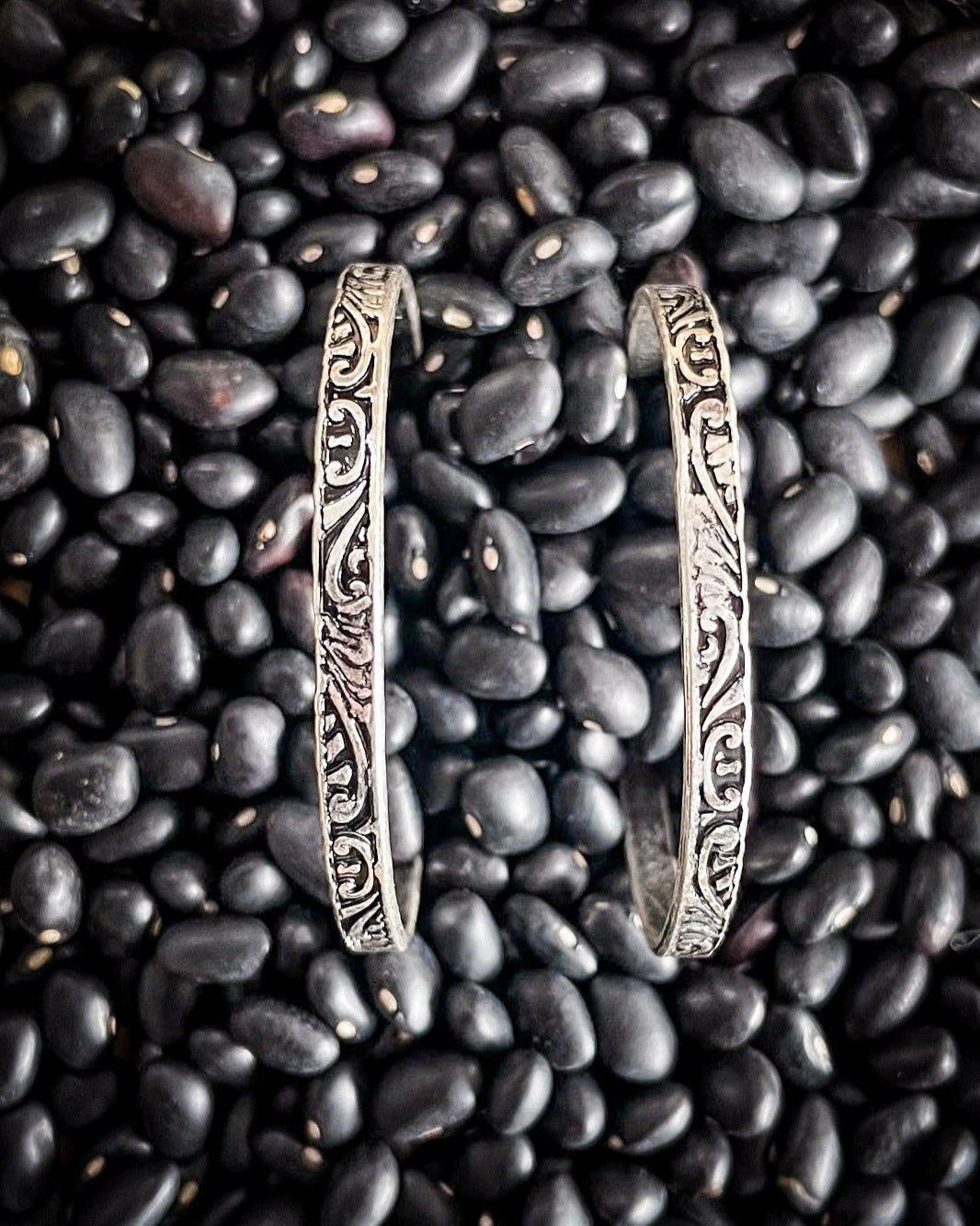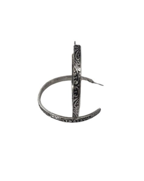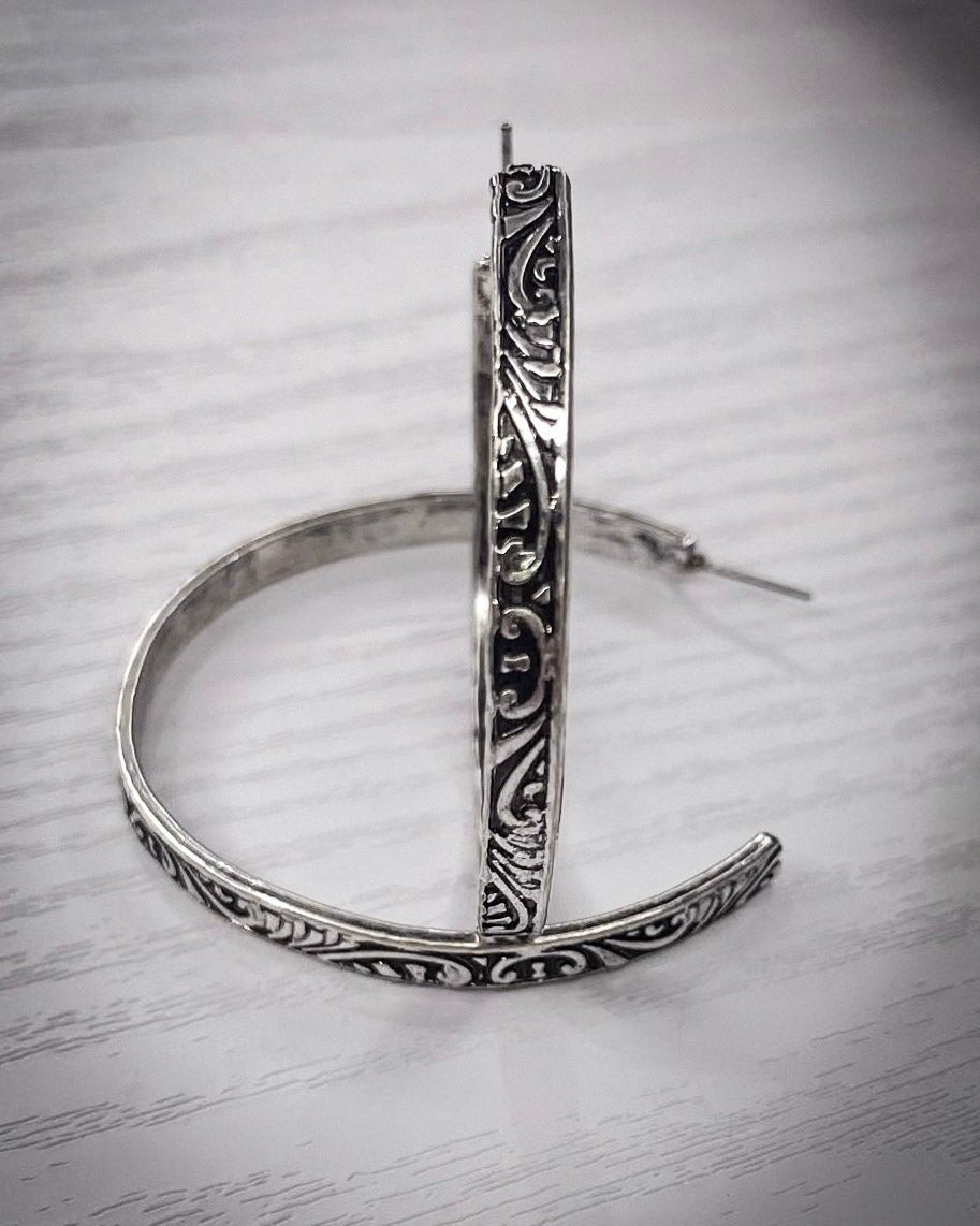 Each 2-inch hoop features intricate, folk-style scrollwork detailing that mimics hand-tooled leather patterns, making them an eye-catching yet versatile addition to your jewelry box. The silver-tone metal catches the light just right, offering enough shine to elevate your everyday look while still pairing effortlessly with casual, denim, or boho-chic pieces.