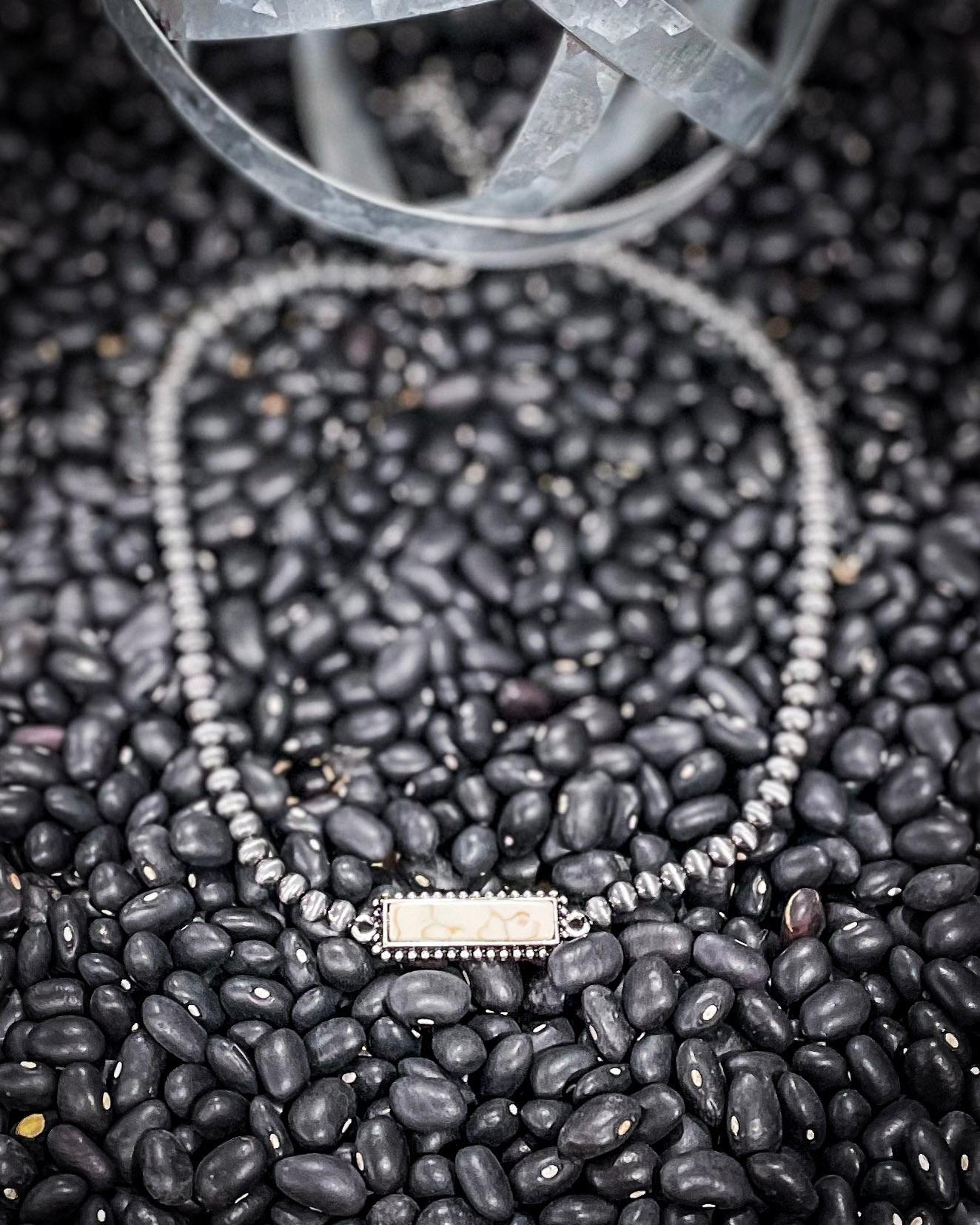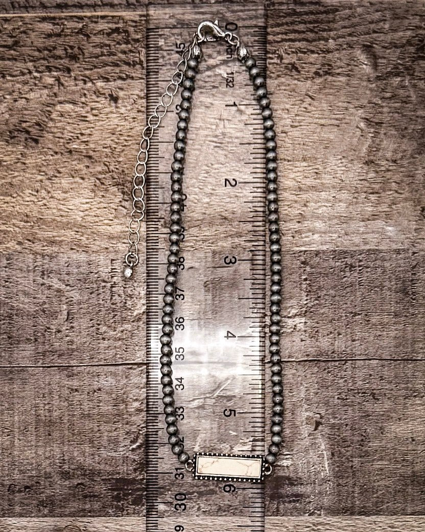 The Lexi Navajo Style Fashion Stone Choker is a delicate yet distinctive piece that blends southwestern tradition with a clean, modern feel. Made with 4mm silver-tone faux Navajo pearl beads, this choker is accented by a rectangular faux stone centerpiece framed with detailed silver beading for just the right touch of texture.