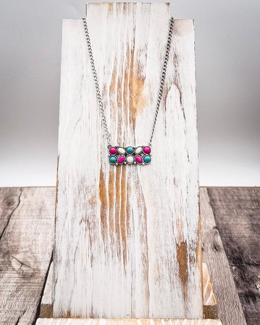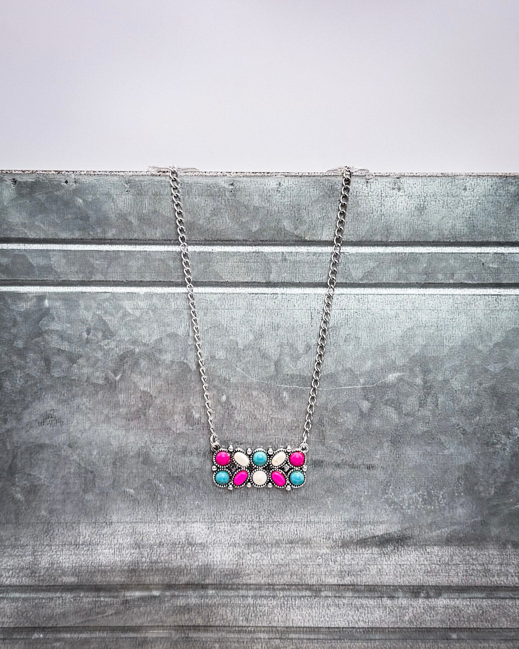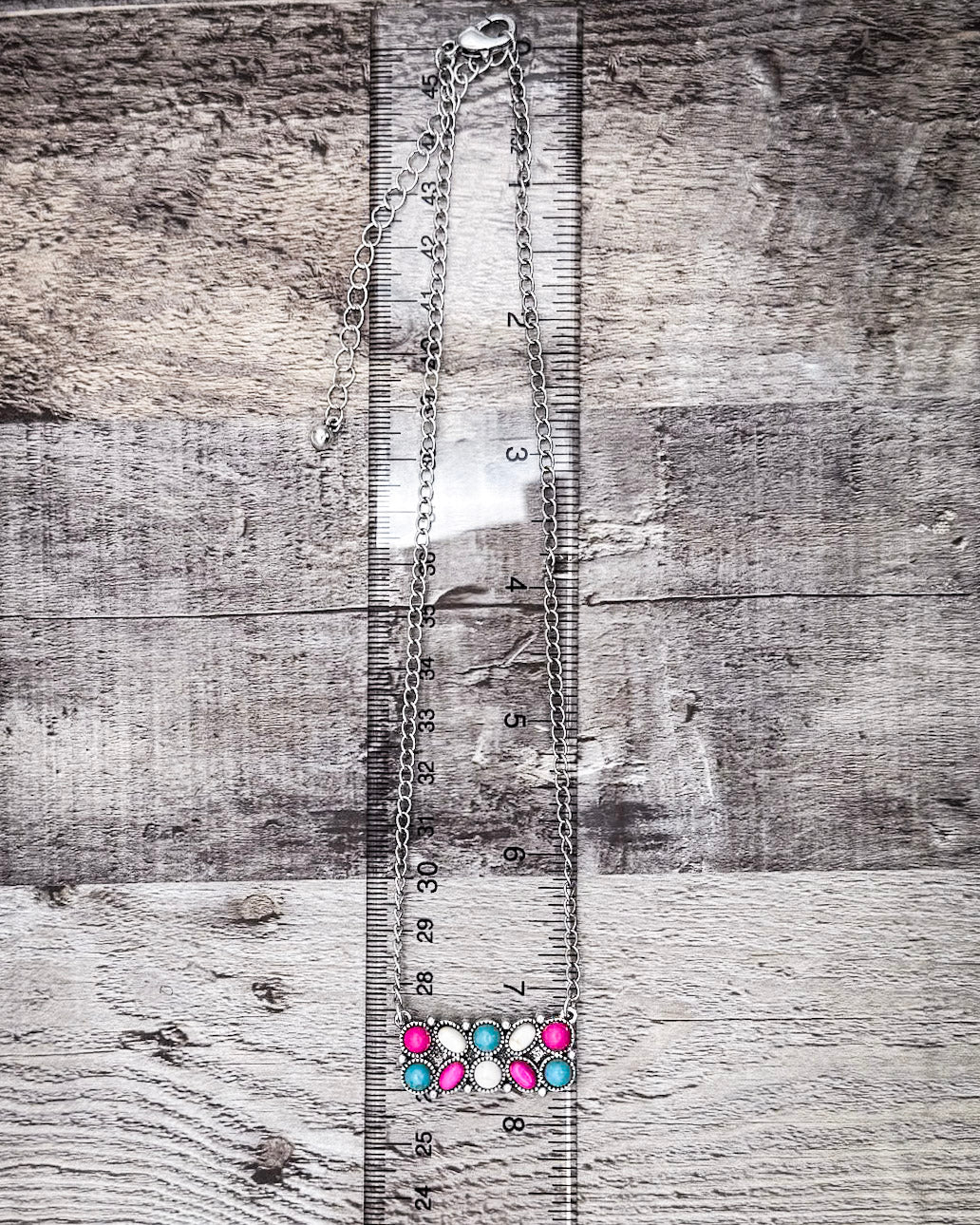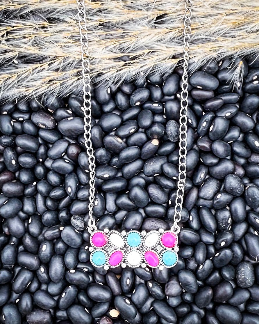 Bright, bold, and full of western charm — the Desert Bloom Bar Fashion Necklace captures the spirit of the Southwest in one stunning statement piece. Set on a sleek silver chain, this necklace features a bar pendant inlaid with colorful stones in turquoise, magenta, and ivory, creating a vibrant pop of color that’s both playful and sophisticated.