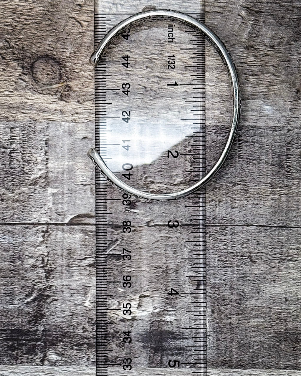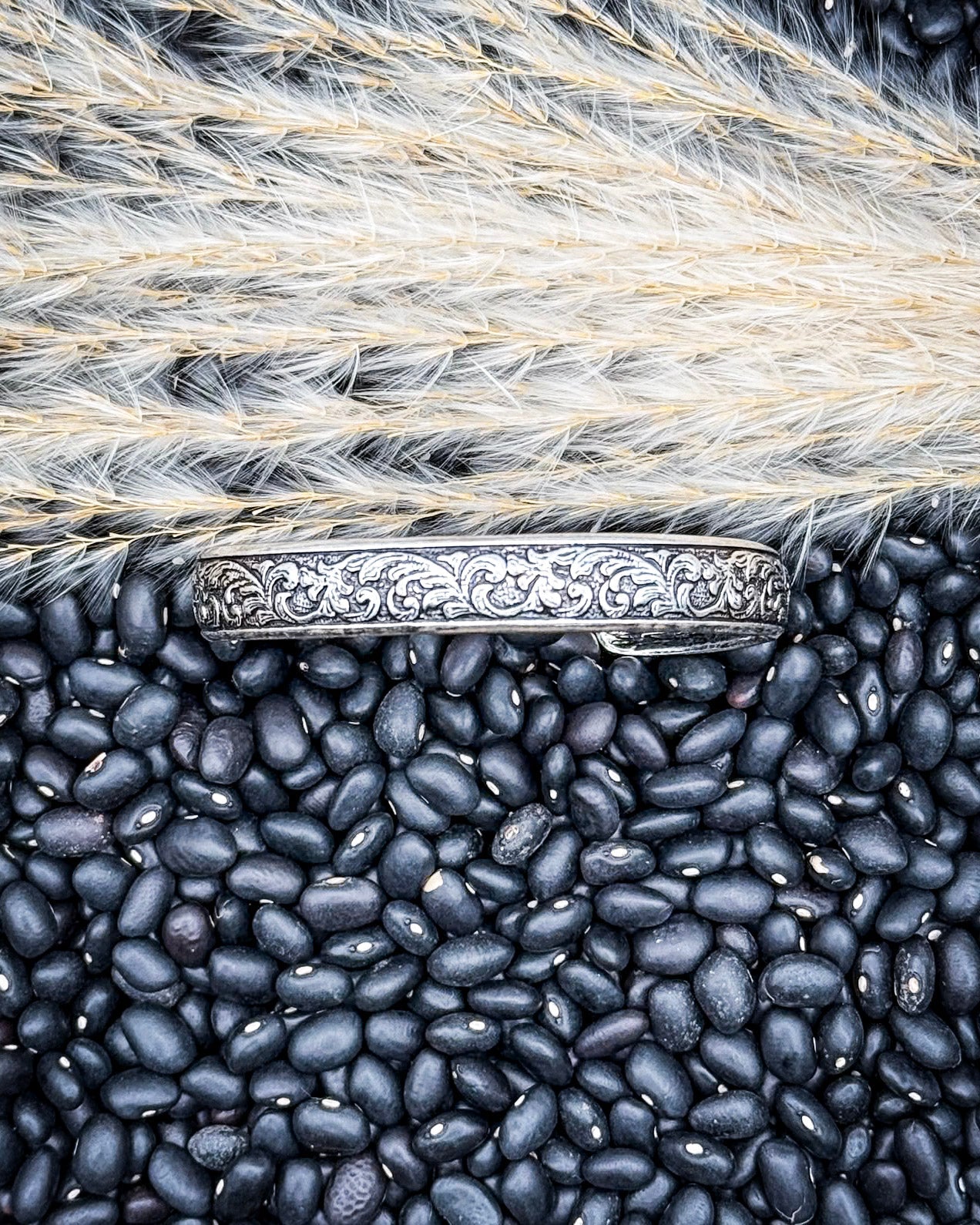 The Saddle Creek Silver Cuff embodies classic western elegance with a touch of rugged charm. Featuring intricate floral scrollwork etched into antique silver, this cuff tells a story of craftsmanship and timeless style.
