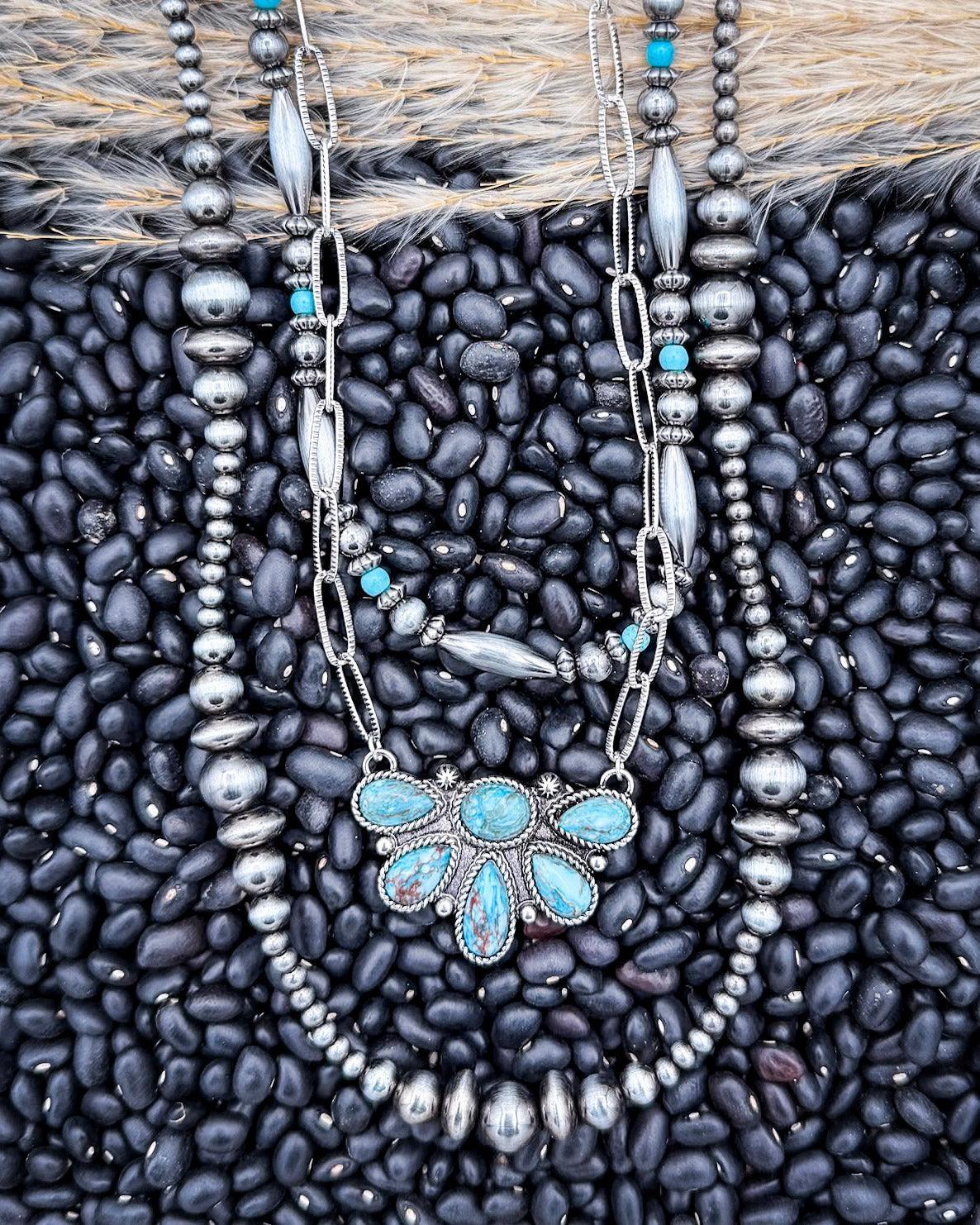 Featuring three layered strands with a faux turquoise floral pendant centerpiece, the Sagebrush Skies is perfect for pairing with a graphic tee, flowy dress, or your favorite denim jacket. Whether you’re headed to a rodeo, concert, or a night out, this statement necklace completes your look with effortless cowgirl grace.