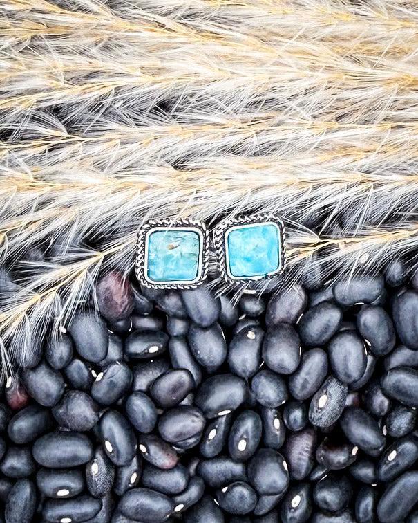 Simple, striking, and timeless — the Sierra Spirit Studs capture the essence of western sophistication. Each earring features a polished faux turquoise stone set in a detailed silver toned rope border, creating a look that’s both classic and effortlessly chic.