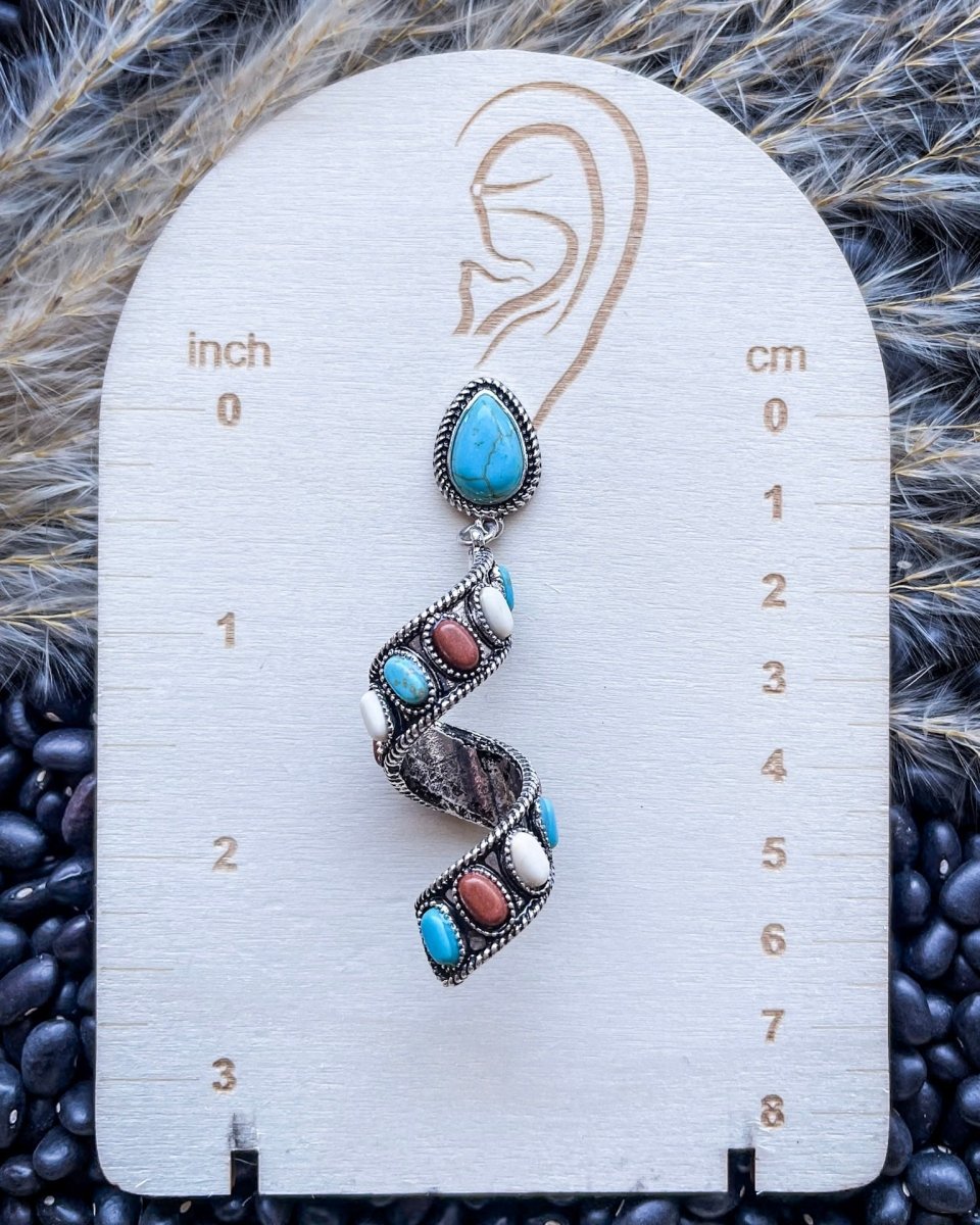 Turn some heads with the bold, free-spirited style of our Sister Post Dangle Fashion Earrings. These silver-tone statement earrings feature a teardrop-shaped faux turquoise post that anchors a twisting ribbon of metal set with alternating faux turquoise, rust-colored, and ivory stones. The mix of colors and textures gives them that perfect balance of western tradition and playful personality.