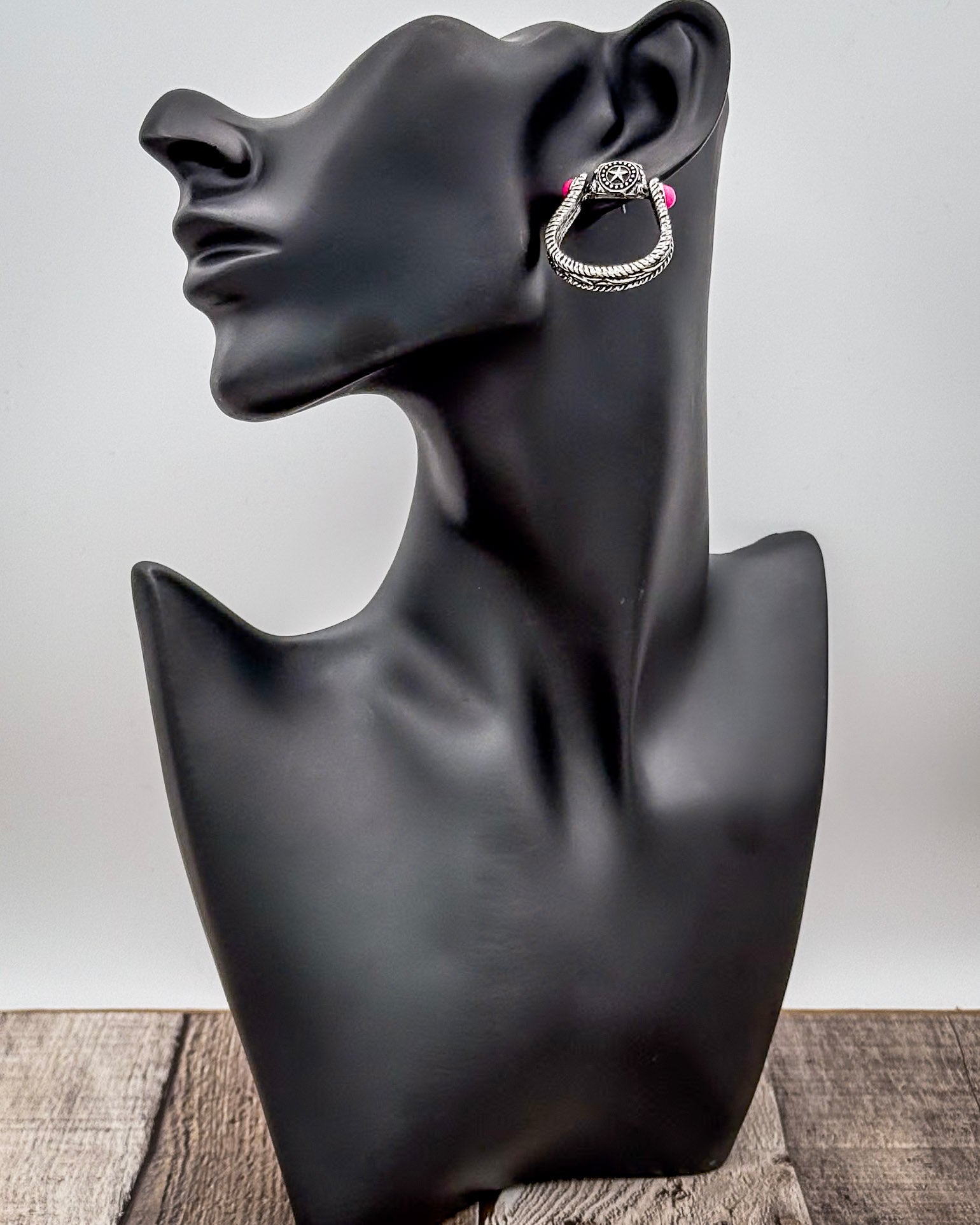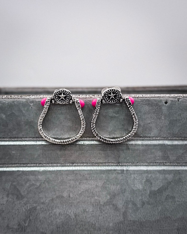 Turn heads with the Star Stirrup Stud Earrings, a perfect mix of western grit and feminine charm. These silver-tone stirrups feature detailed star engravings and pops of pink bead accents that add a bold, playful twist to classic cowgirl style. Lightweight yet eye-catching, they’re perfect for pairing with denim, boots, or a flowy dress for that effortlessly western look.