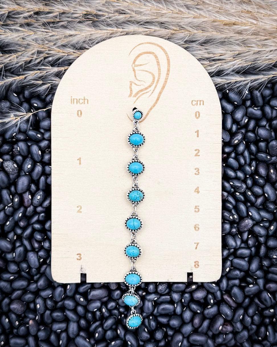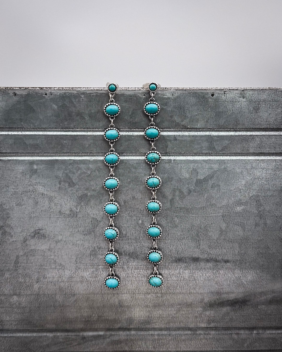 Add a touch of bold western beauty with the Teal Mesa Drop Fashion Earrings. Featuring a graceful cascade of faux turquoise stones set in intricate silver rope detailing, these earrings embody the spirit of desert sunsets and open-sky adventures. Their lightweight design ensures comfort from sunrise to rodeo night, while the vibrant turquoise hue brings just the right amount of cowgirl flair to any outfit. Perfect for pairing with denim, dresses, or your favorite tooled leather accessories.