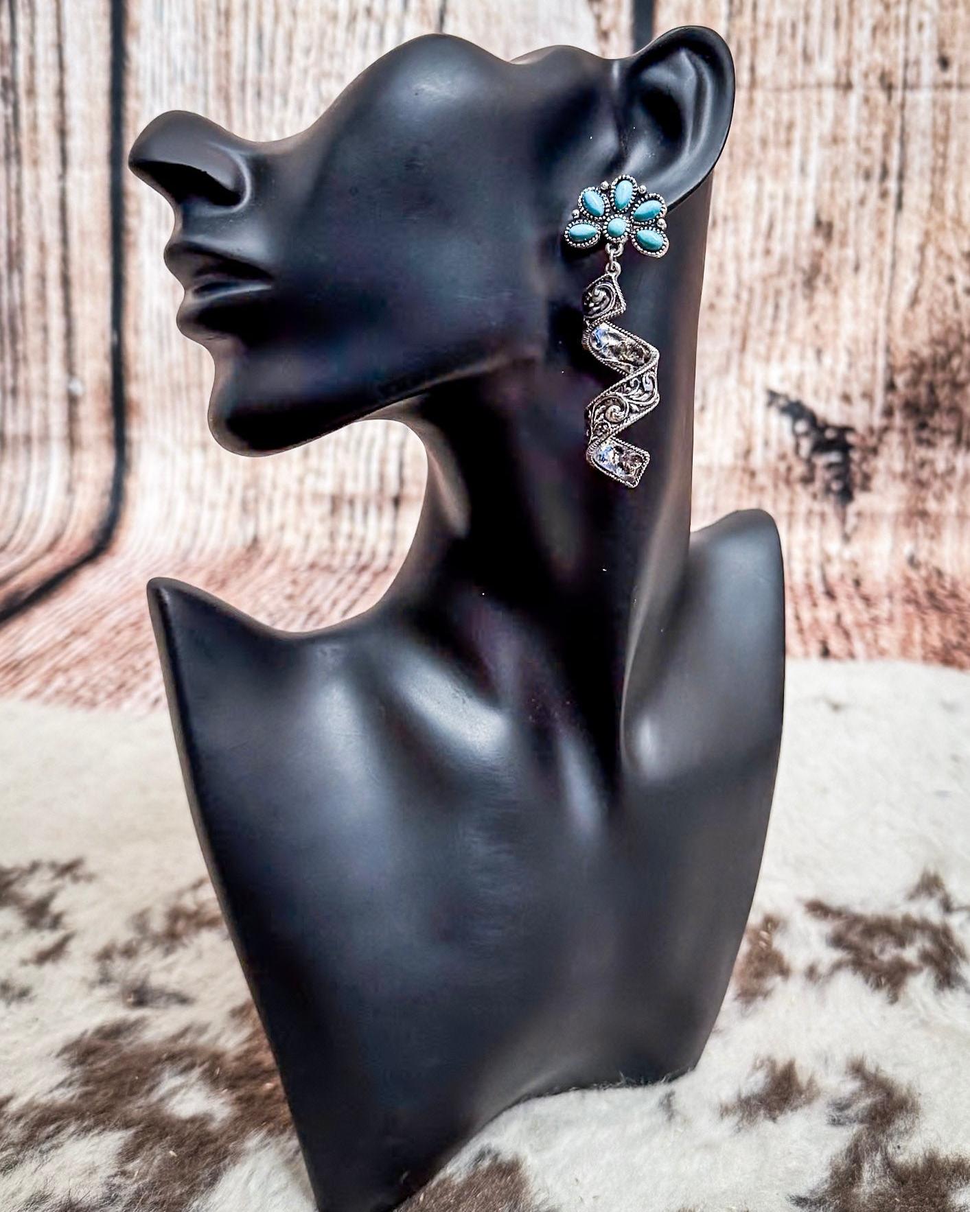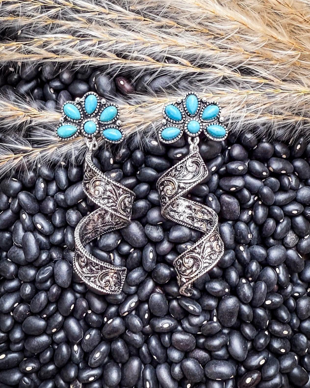 Say hello to your new favorite statement studs: The Desert Bloom Spirals. With delicate western filigree, a soft antique silver finish, and bright aqua stone floral studs, these earrings are the perfect mix of bold charm and graceful movement.