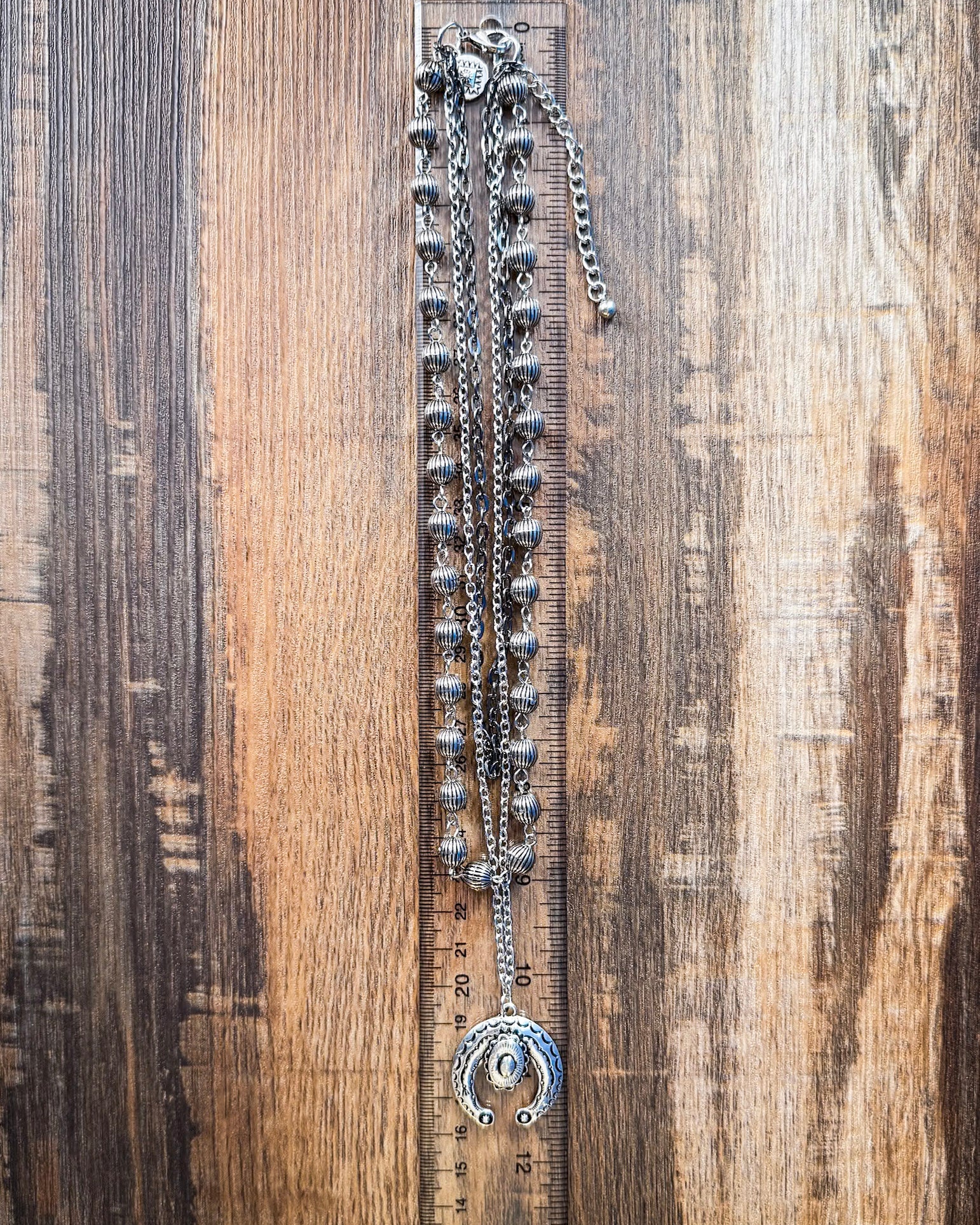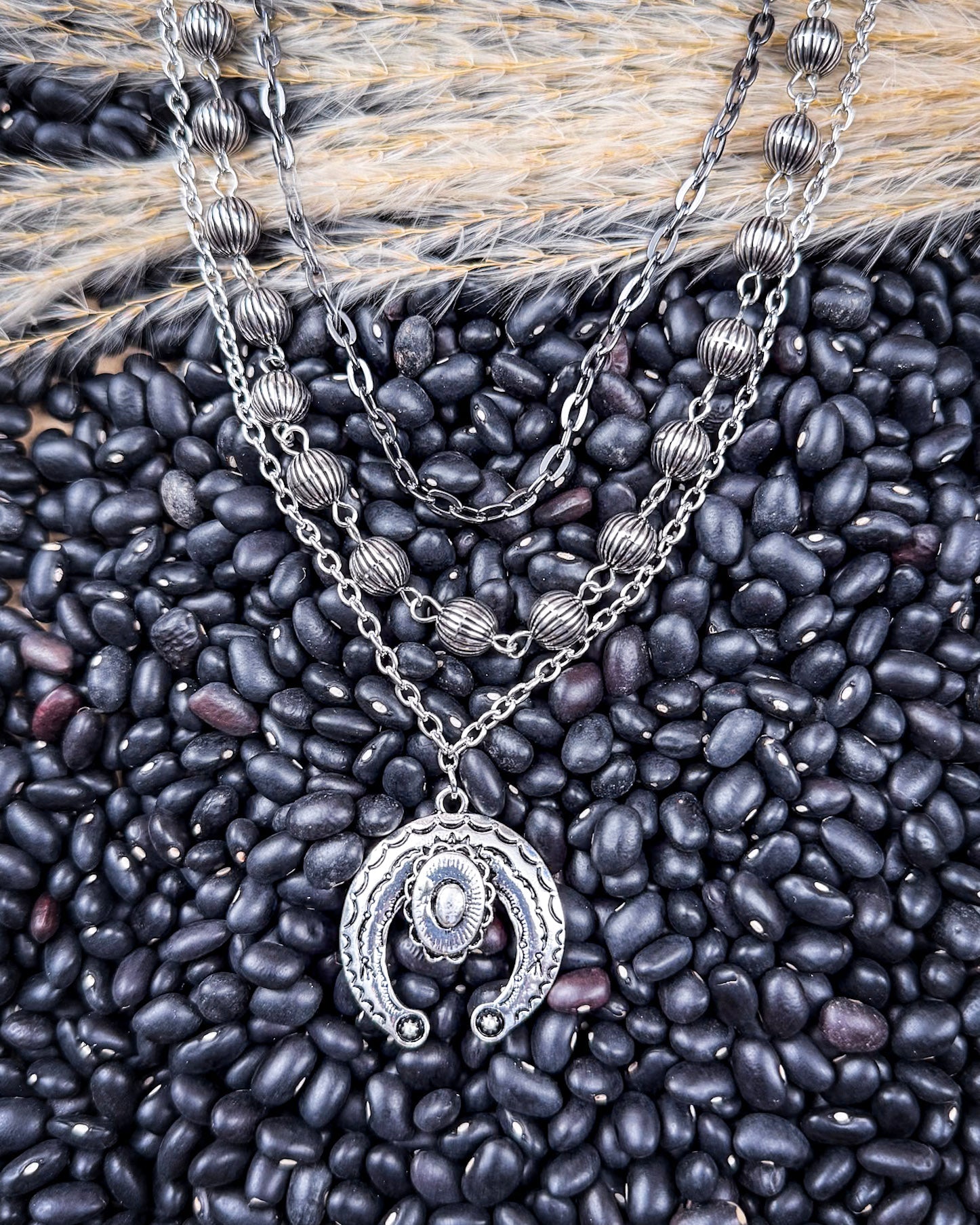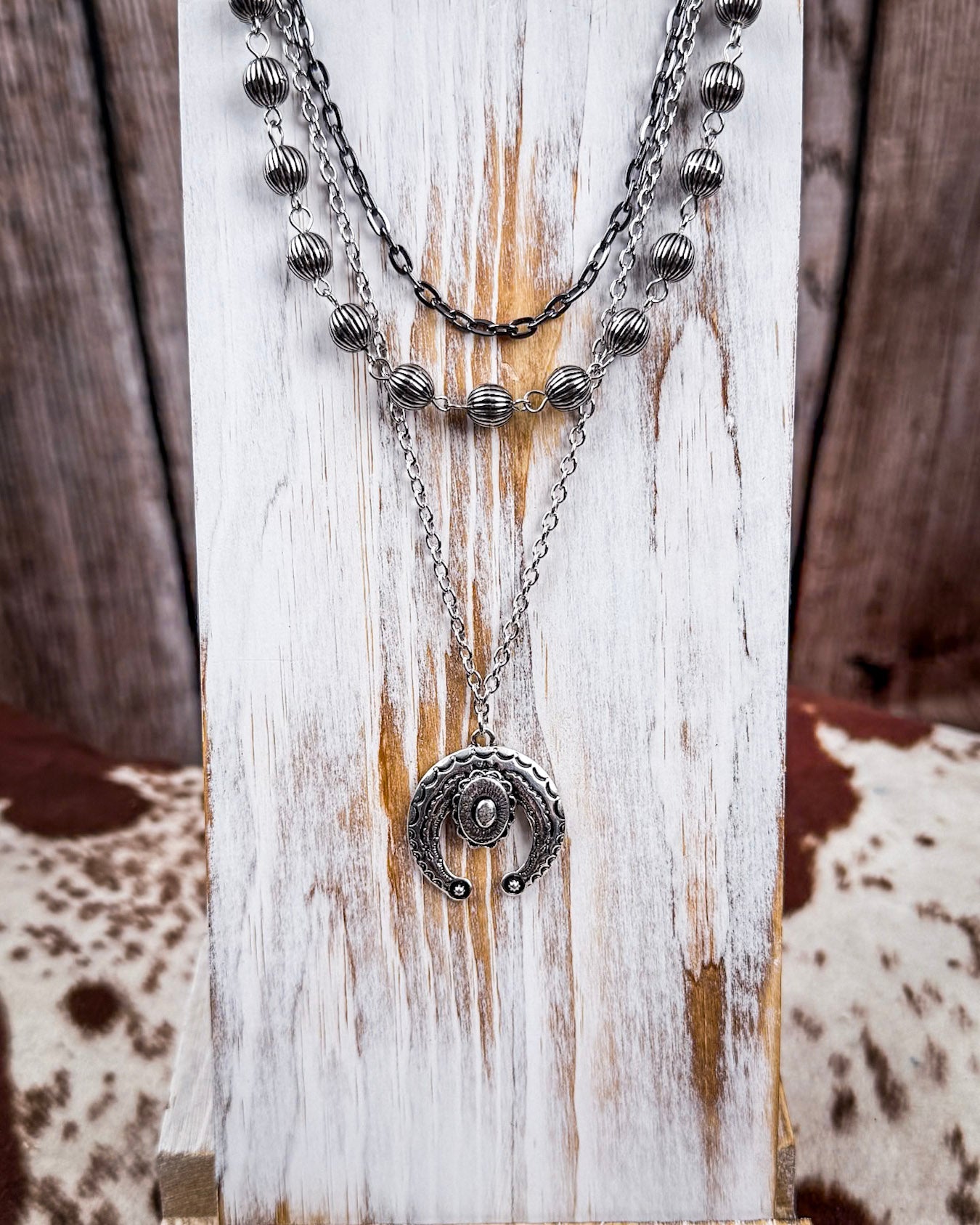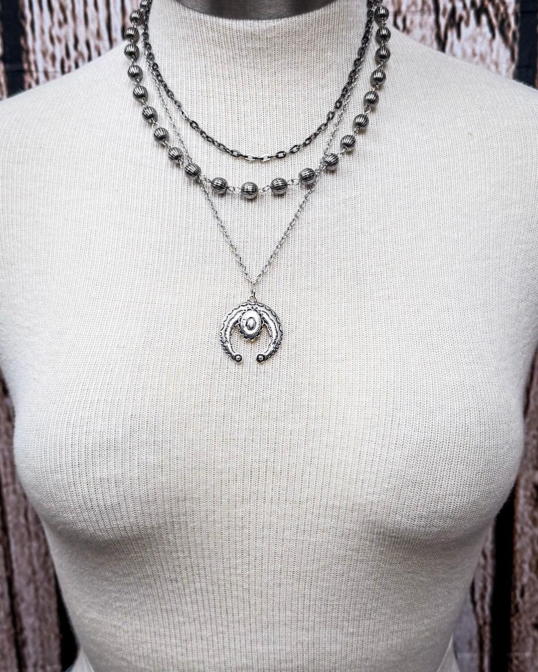 Named for the convergence of historic trails that carried dreamers westward, the “Three Trails” in its title symbolize journey, strength, and connection. These same principles are echoed in its design, which gracefully weaves three distinct layers into one harmonious piece. From its cascading silver toned chains to its textured, antique-finished beads and symbolic squash blossom pendant, every element reflects thoughtful craftsmanship and bold spirit.