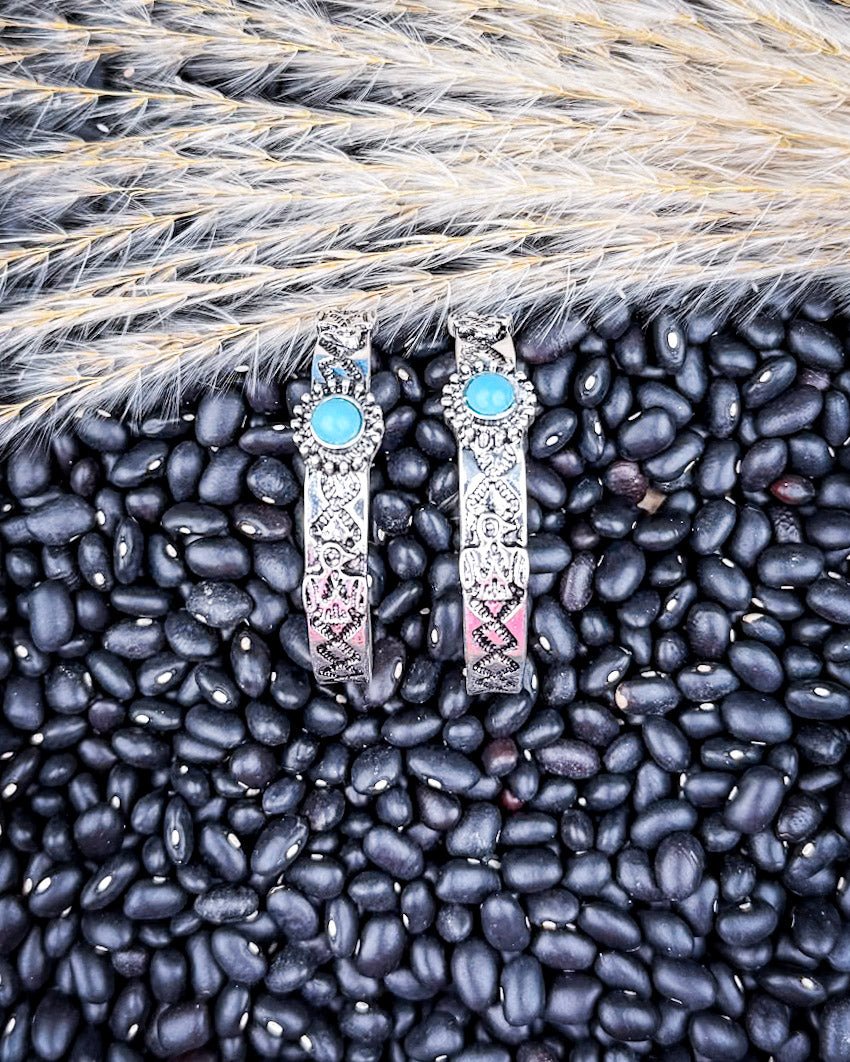 For a laid-back look, pair the Thunderbird Hoop Earrings with a messy bun or low ponytail so the detailing really shows. Going for something more polished? Let them peek out from under loose curls or beachy waves. The turquoise hue works beautifully with neutrals, but also pops against jewel tones like deep burgundy or emerald green.