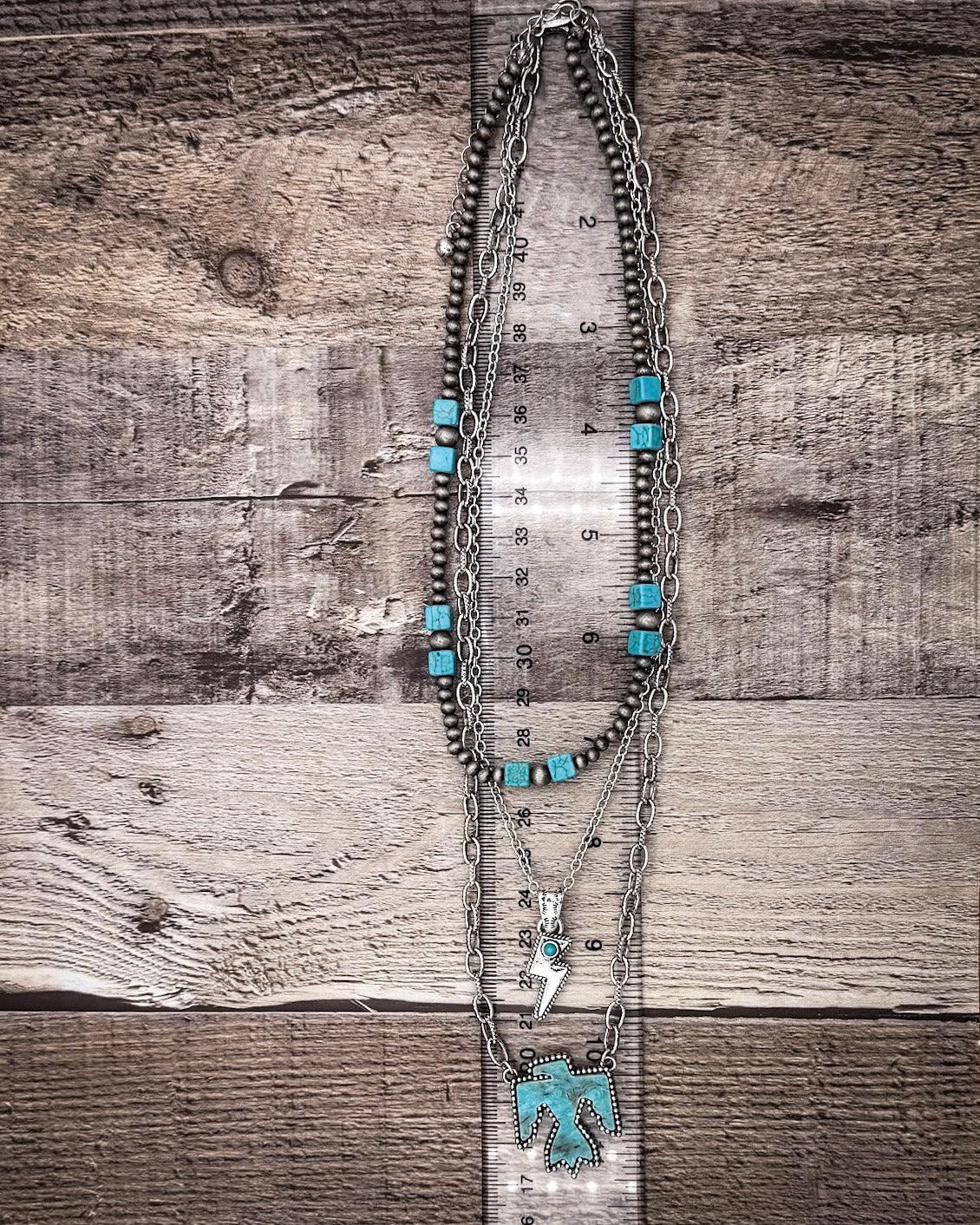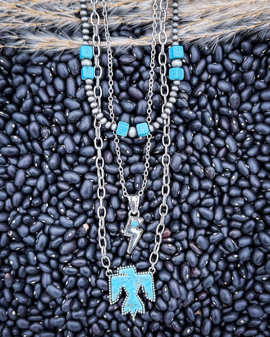 Unleash your inner wild spirit with the Wild Thunder Fashion Necklace, a stunning layered statement piece that blends western grit with boho charm. Featuring three tiers of silver chains, faux turquoise beads, and signature pendants — including a lightning bolt and a thunderbird — this necklace brings just the right mix of bold energy and timeless style.