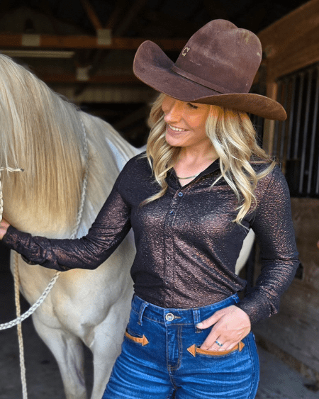 Bring a touch of glam to grit with the Cowgirl Tuff Cocoa Rodeo Royalty Pullover. This rich cocoa brown shimmer shirt is a standout choice for the competitor who wants to sparkle under pressure. Whether you're racing the timer or leading the victory lap, this top blends sleek shine with serious performance.