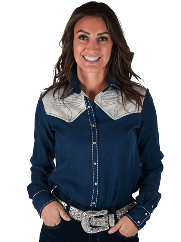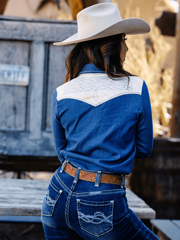 Cowgirl Tuff “Prescott Pearl Snap” – Denim Button-Up with Boot Stitch Embroidery