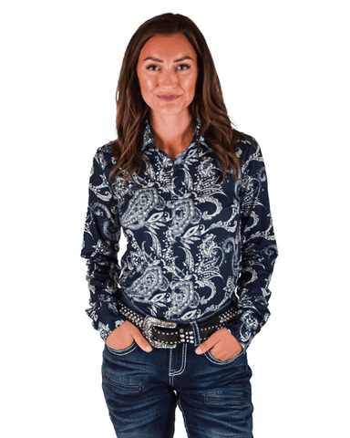 Bold, polished, and made to move—this one’s not just pretty, it’s practical. The Sapphire Prairie Winds Pullover Button Up from Cowgirl Tuff blends classic western style with smart design made for the real demands of competition. That rich sapphire paisley print brings just the right amount of pop, while the lightweight stretch fabric keeps you comfy from sunup to showdown. Whether you're in the saddle or just want a shirt that stays put and looks sharp, this one's built to hold its own.