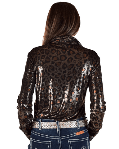 Golden hour, but make it wild. The Sunkissed Safari Pullover Button Up brings a bold mix of copper and gold shimmer over a soft leopard print, giving you just the right amount of shine without going over the top. It’s lightweight, high-stretch, and easy to move in—so whether you're chasing barrels or just chasing the sun, this top’s got your back.