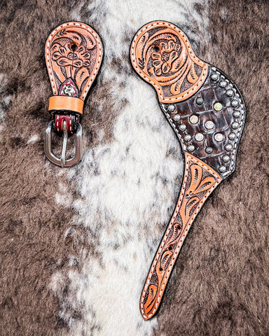 Designed for riders who appreciate both style and substance, this pair features a striking contrast between the warm tooled leather and deep chocolate faux reptile texture. The floral tooling is crisp and clean, flowing across each strap with natural movement. Every detail is thoughtfully placed, from the curves in the leather to the delicate scrolls that frame the edges. It’s western tradition, refined and refreshed.