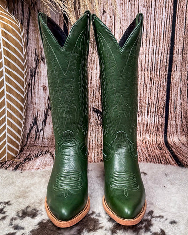 Striking and refined, the Eden Black Star Leather Boot in Emerald is made for those who love classic western design with a bold twist. With its tall emerald shaft and burnished leather finish, this boot delivers elegance with just the right amount of edge.