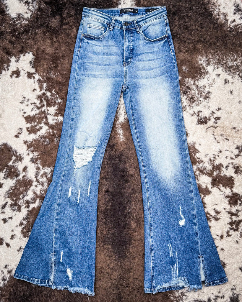 The Jordan High Rise Medium Wash Distressed Flare Jeans deliver the perfect blend of rugged Western attitude and figure-flattering design. With their dramatic flare, bold front slits, and broken-in distressing, these jeans don’t just make an entrance—they make a statement.