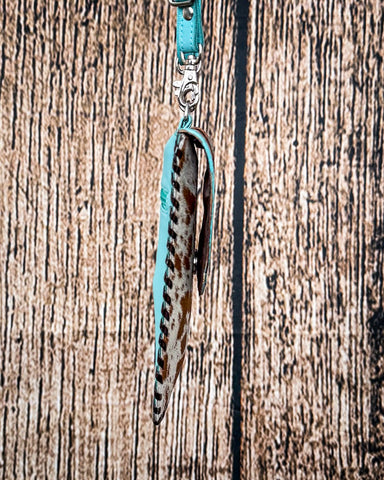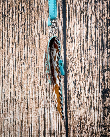 This phone crossbody by Sixtease Bags is all about mixing fun and function. The vibrant turquoise strap and floral inlay make a bold statement, while the genuine hair-on hide and tooled leather flap keep things rooted in that timeless western soul. The black whipstitch detailing along the edge adds a hand-finished touch that feels artisan and one of a kind.