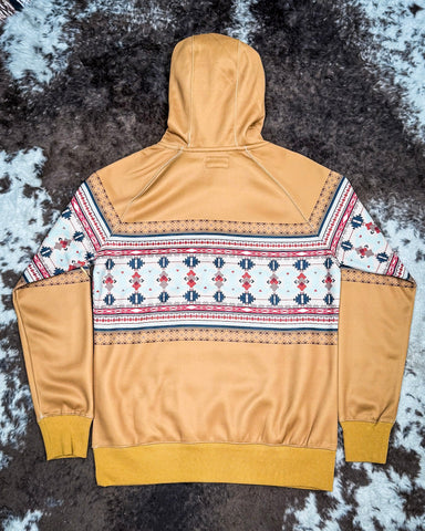 This one’s got a mustard tan base with a warm, earthy tone that’s flattering on just about everyone. It’s accented with a full-color thunderbird-inspired pattern across the chest, sleeves, and back, giving it a cohesive, eye-catching look from every angle. No matter where you’re standing—front or back—this hoodie shows off your style.