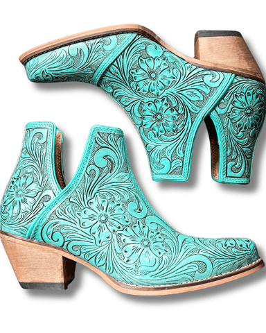 Bring bold color and timeless craftsmanship to your wardrobe with the Myra High Mesa Booties in Turquoise. Crafted from genuine leather and hand-tooled with an intricate floral desert blossom design, these boots are as unique as they are eye-catching.