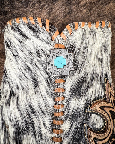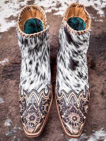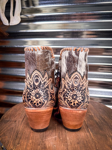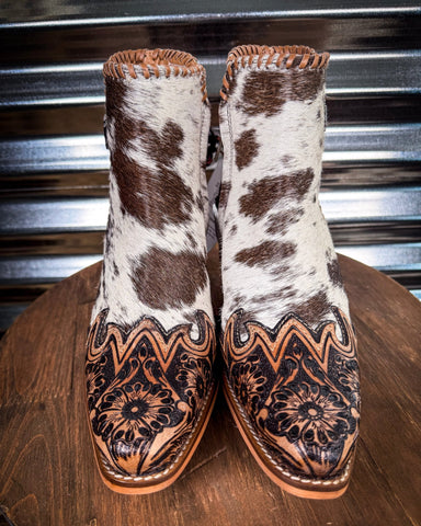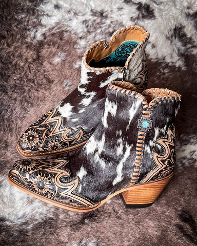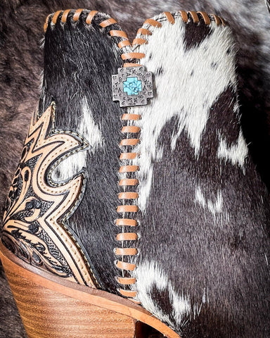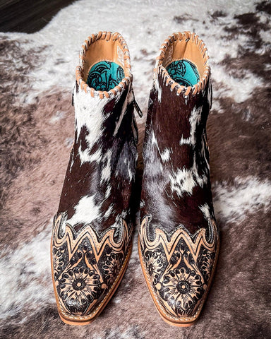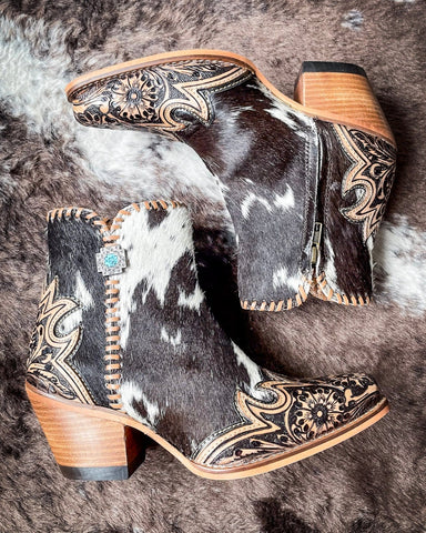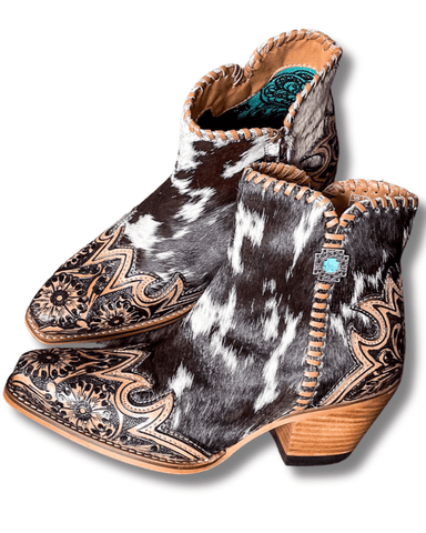Bold and unforgettable, the Myra Margie Ankle Bootie blends hair-on-hide leather with hand-tooled western detailing for a look that’s equal parts edgy and elegant.