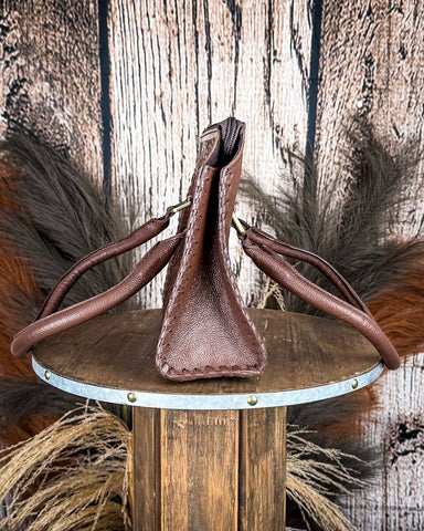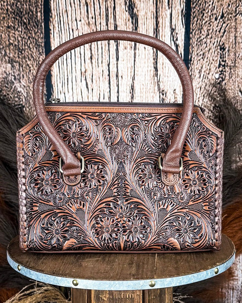 Made from rich, genuine brown leather, this tote bag celebrates Western heritage with hand-tooled floral scrollwork that covers the entire exterior. Each detail is meticulously carved, creating an heirloom-quality piece that feels as authentic as it looks. The warm, earthy tone of the leather adds depth and character while making it a versatile staple that works with both neutral and bold wardrobe pieces.