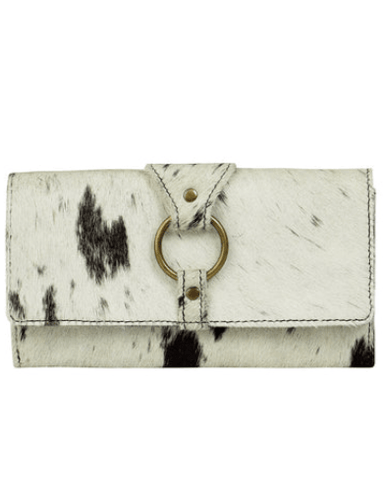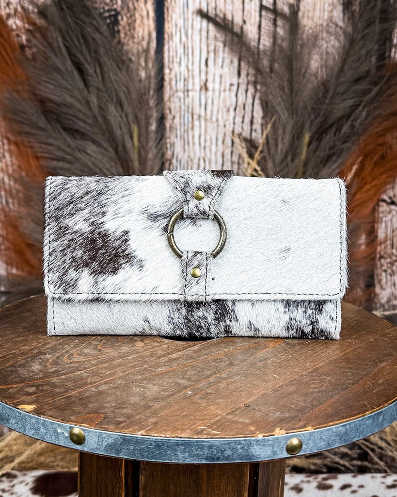 The exterior showcases a bold hair-on cowhide pattern, with no two pieces alike—each wallet is completely unique in its natural hide markings. A front flap design folds neatly over and is secured with a snap button and a decorative brass ring, adding a touch of rugged elegance while keeping your essentials safely tucked inside.