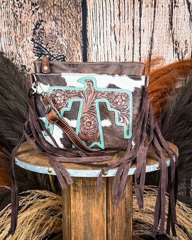 Crafted by Sixtease Bags, this crossbody is a bold take on modern western style. Featuring a detailed Thunderbird design tooled into rich brown leather and accented with turquoise inlay, Quill carries the energy of freedom and strength in every stitch. It’s set against genuine hair-on hide—no two bags will ever look the same, and that’s exactly the point.