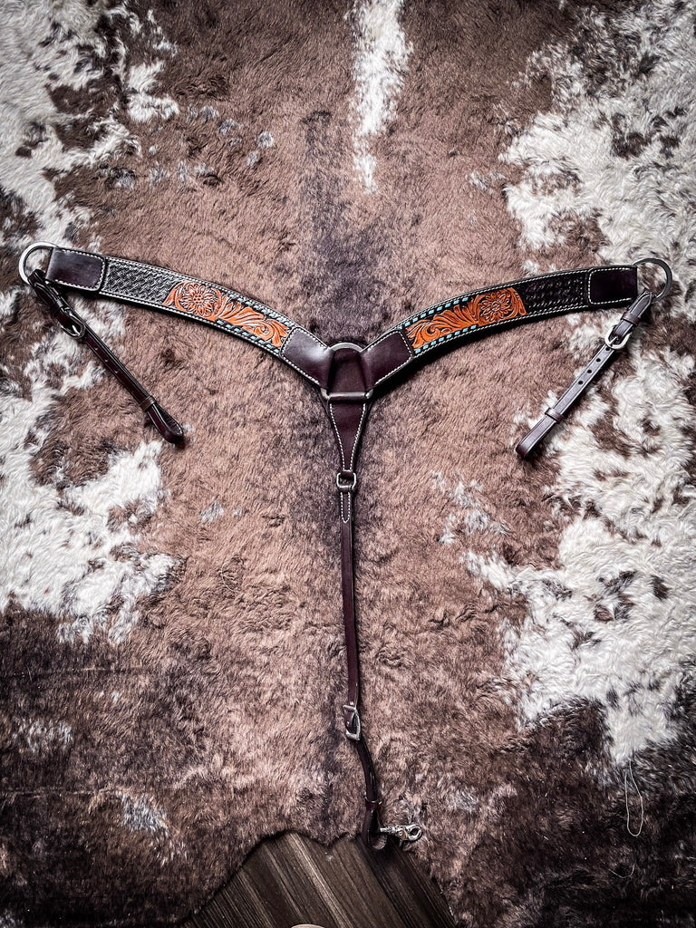 The Royal King Benton breast collar has an eye-catching look. Combining medium oil hand tooling on a rich dark oil background with a pop of color provided by the turquoise buckstitch. Stainless steel hardware, adjustable tugs, and center strap.