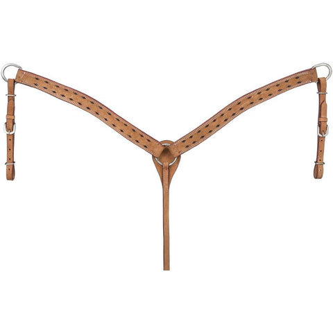 Simple and classic, the Branson breast collar looks good on any horse! The rugged roughout leather is accented with chocolate brown buckstitching and a double-stitched white edge. The contour cut allows this breast collar fit comfortably across the shoulders. Includes adjustable tug straps and stainless steel hardware.