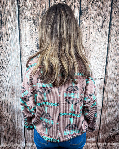 Bring warmth, color, and comfort to your wardrobe with the Colorado Sunset Sweater. Inspired by the beauty of western skies, this stunning top features a bold Aztec-inspired pattern in turquoise, brown, and red tones — a perfect reflection of a Colorado sunset.