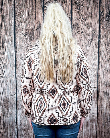 Featuring a stunning desert-inspired geometric print in neutral sand and chocolate tones, this piece is as stylish as it is cozy. The oversized fit gives it that relaxed, lived-in feel you’ll love, while the kangaroo pouch pocket adds both convenience and charm.