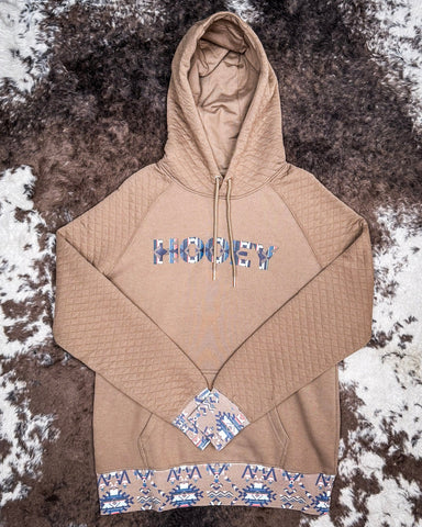 Let’s talk about the color—Shitake Brown is rich, earthy, and neutral enough to pair with just about anything in your closet. But it’s the bold “HOOEY” lettering across the chest and that subtle pop of Aztec print at the cuffs and hem that give this sweatshirt its western edge. That patterned trim adds personality without being loud—just enough to show off your style without shoutin’ it from the rooftops.