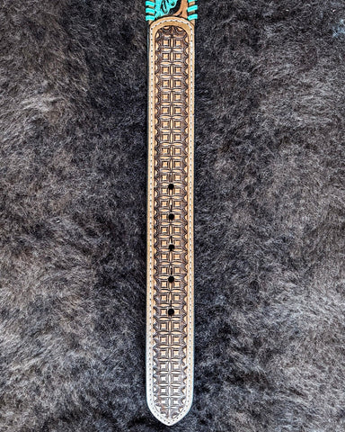 Add a touch of elegance to your western wardrobe with the Tropical Rainforest Hand-Tooled Concho Belt. Featuring intricate floral patterns etched into premium leather, this belt is a masterpiece of craftsmanship. A turquoise stone accents the design, adding a vibrant pop of color that stands out beautifully. Complete with a removable buckle for versatility, this belt combines timeless charm with modern flair, making it perfect for any outfit. Whether paired with jeans or a dress, its classic yet bold style makes a statement.
