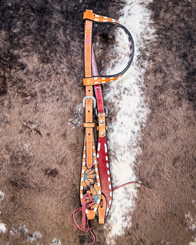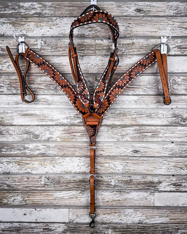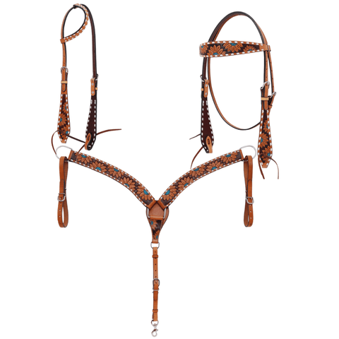 Let’s start with the look. Warm chestnut leather sets the stage for a vibrant sunflower design, finished with pops of turquoise that catch the eye without overpowering. It’s a perfect blend of classic floral style and fresh western flair—rich in color, full of texture, and easy to love. Whether you’re out for a weekend ride or gearing up for a show, this set brings a sense of fun and confidence to any setup.