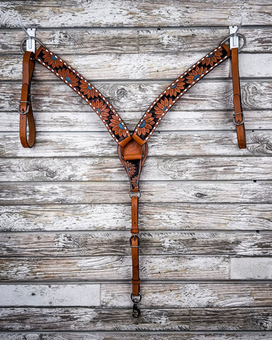 The matching breast collar carries that same sunflower design across the chest, bringing the whole look together without overcomplicating it. It’s balanced, thoughtfully detailed, and designed to lay comfortably across the chest without restricting movement. Every strap is adjustable and built with sturdy hardware that’s ready to ride.