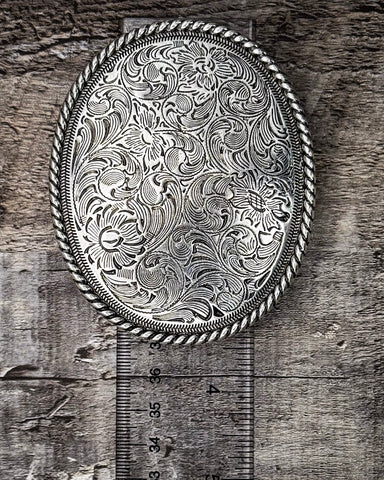Bring timeless Western artistry to your wardrobe with the Whispering Prairie Engraved Silver Belt Buckle. This elegant oval buckle showcases intricate floral and scroll engraving reminiscent of classic saddle tooling, framed by a rope-edge border that adds just the right touch of rugged refinement.