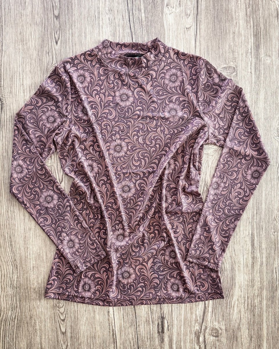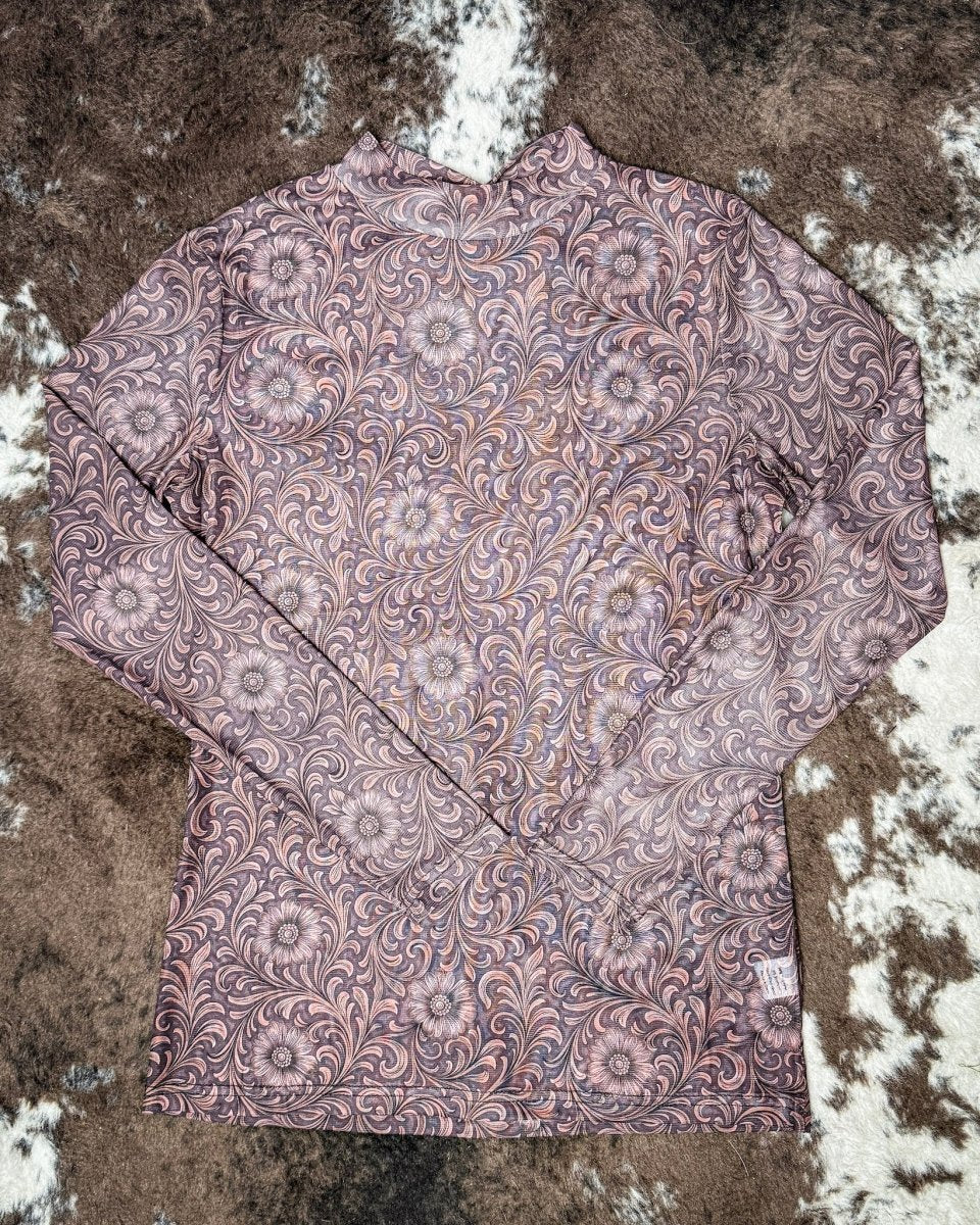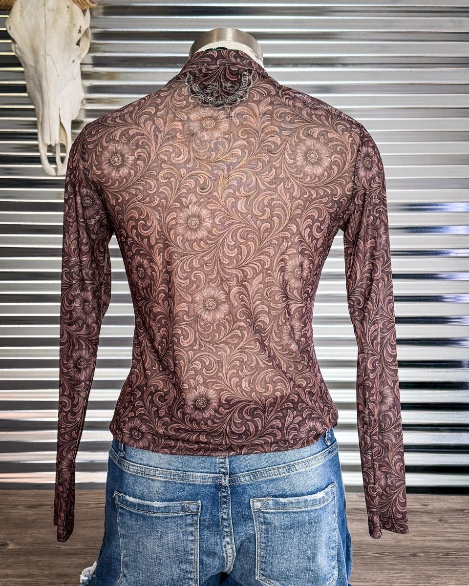Turn heads with the effortlessly bold Bronzed Bloom Mesh Top, designed with a rich mocha base and an intricate floral tooled-inspired print that adds depth and dimension to your look. This piece brings together western artistry and modern styling, giving you a standout layering essential that works year-round.