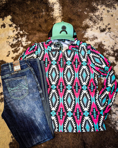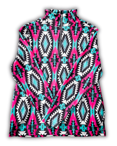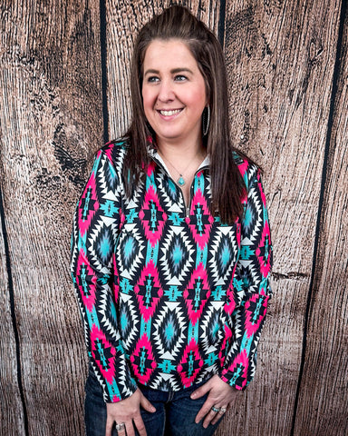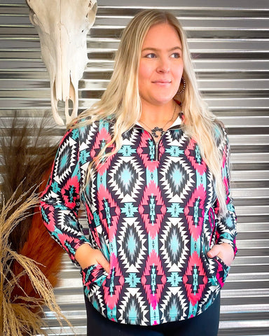 Stand out in bold comfort with the Montezuma Quarter Zip Pullover, a vibrant layering piece made for chilly mornings and laid-back days. Designed with a striking geometric pattern in turquoise, fuchsia, black, and white, this pullover brings a fresh pop of color to every outfit.