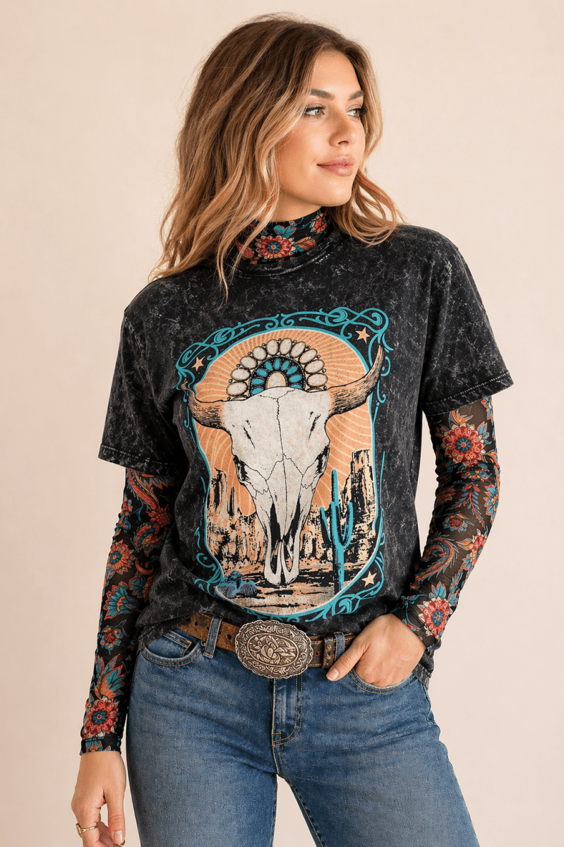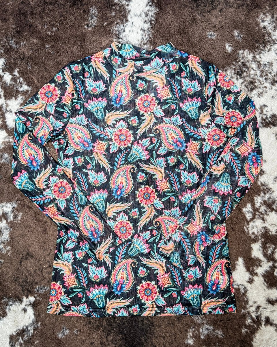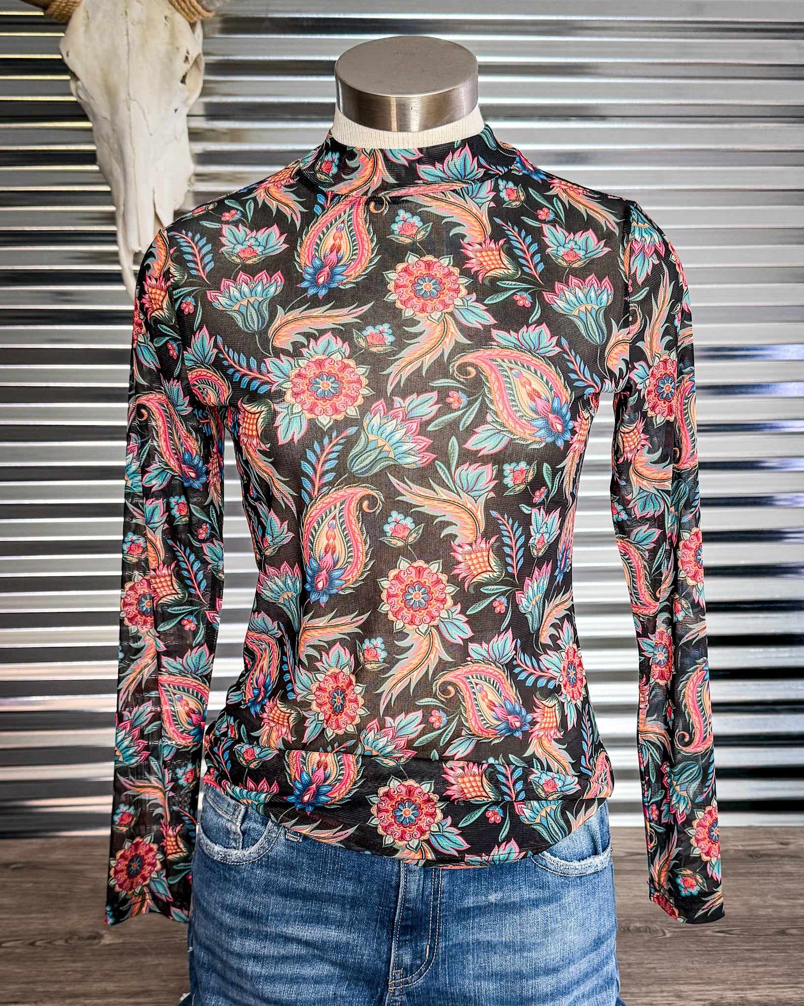 Bring bold color and effortless style to your wardrobe with the Painted Bloom Mesh Top. Set against a rich black backdrop, this vibrant floral print pops with warm tones and intricate detailing, giving you that perfect mix of western charm and modern edge.