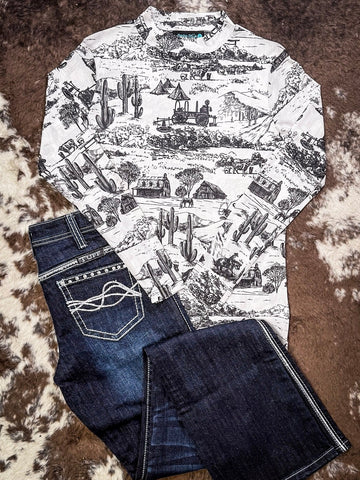 But the real star of the show? The vintage Western print. Etched in a timeless black-and-white palette, the top is adorned with nostalgic desert scenes — think classic cacti, cowboys on horseback, rustic cabins, and sweeping desert landscapes. It’s like wearing a storybook of the Old West, each detail drawn with love and character. The print doesn’t just look good — it tells a story, one that’ll have folks asking where you found such a one-of-a-kind gem.