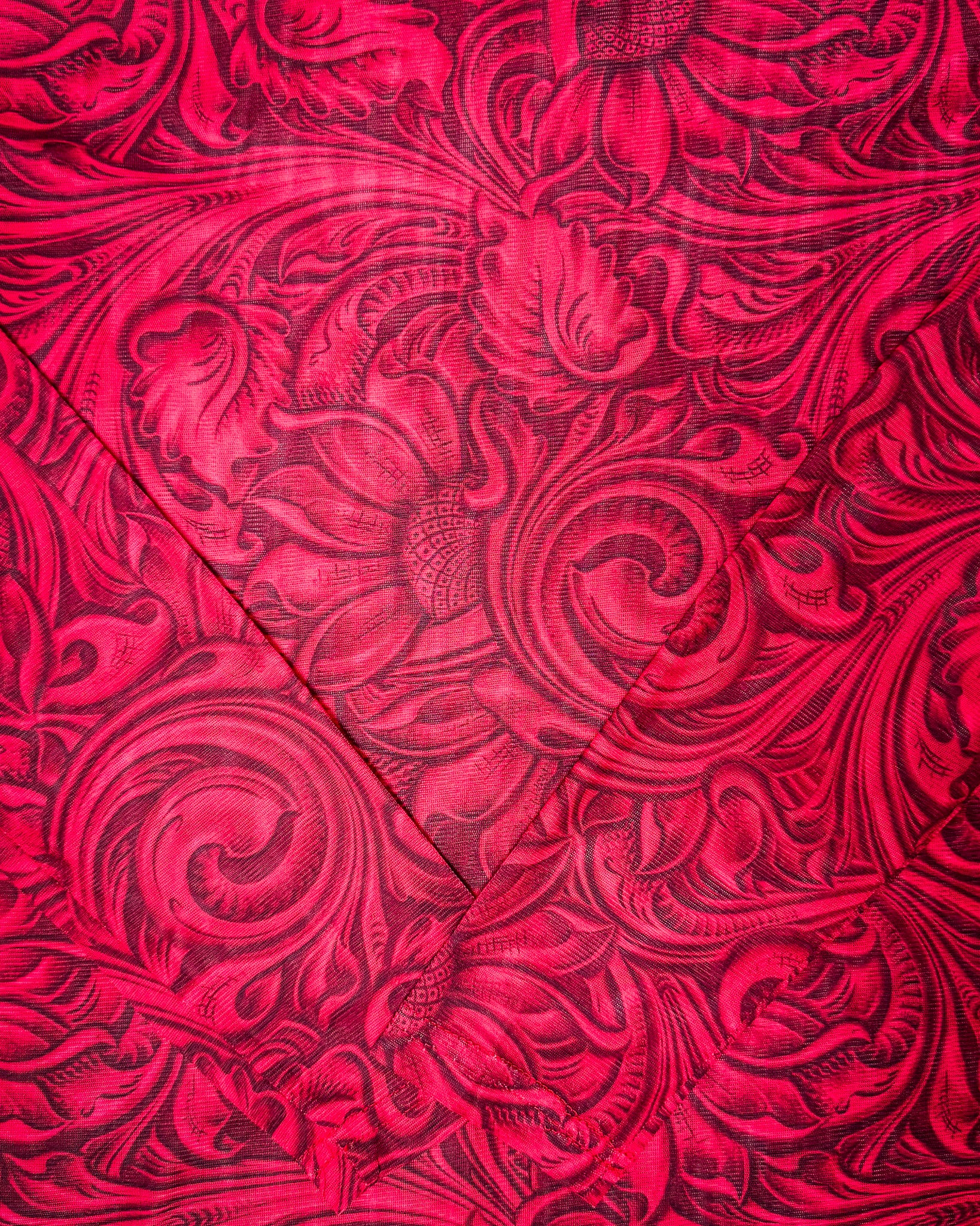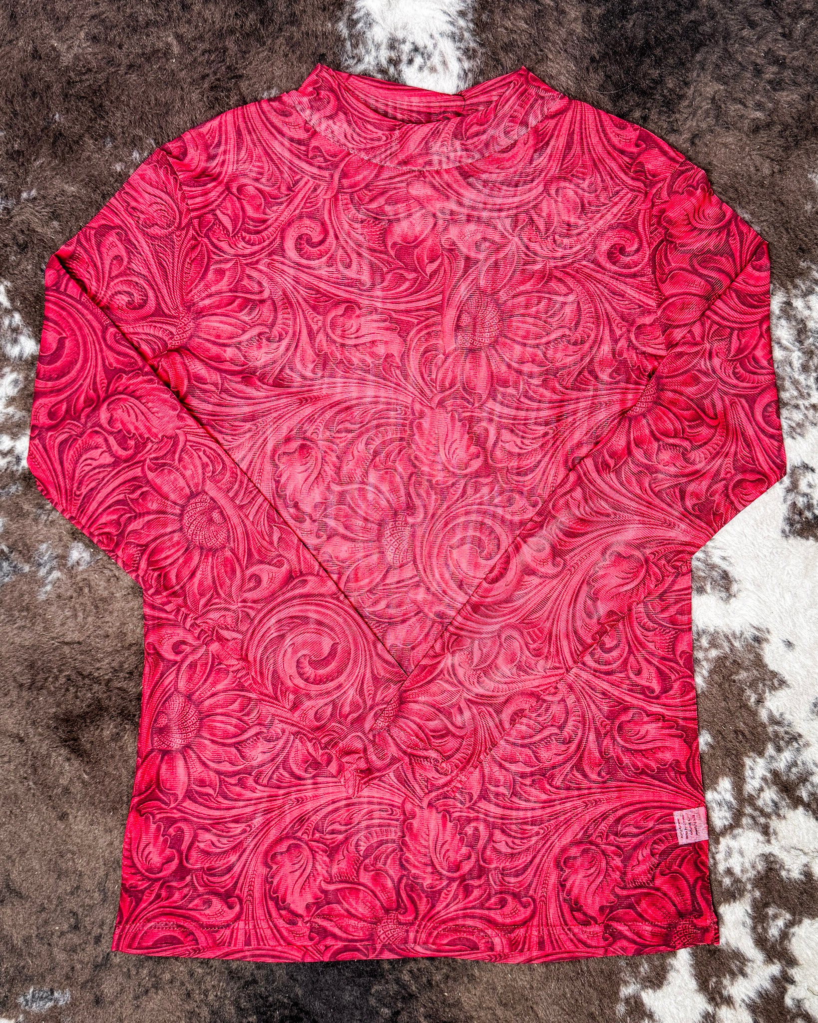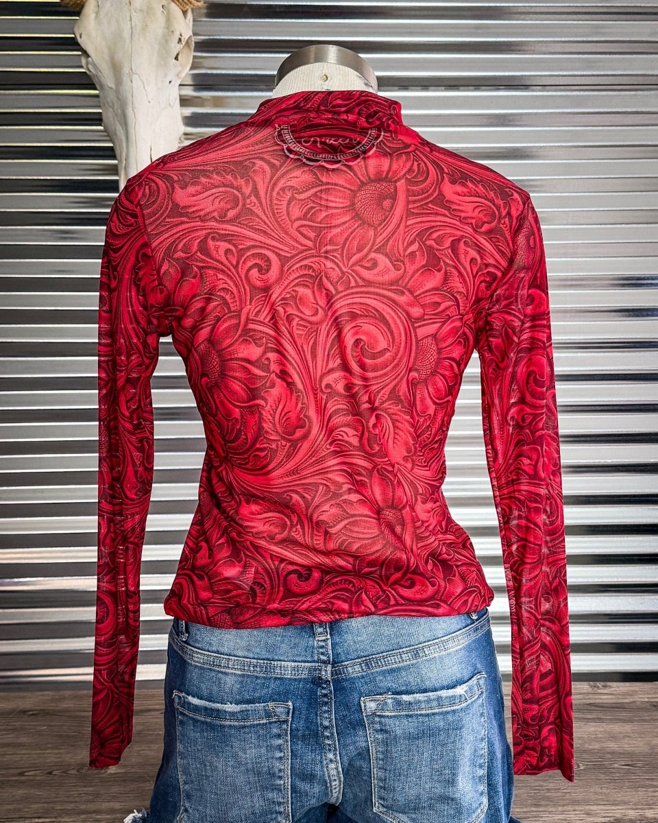 The Tooled in Red Mesh Top brings bold western detail with a sleek, feminine edge. Featuring an intricate tooled leather-inspired print in a rich red tone, this piece delivers standout style while still feeling wearable and versatile. The detailed pattern gives it that classic western influence, while the fitted silhouette keeps the look modern and flattering.