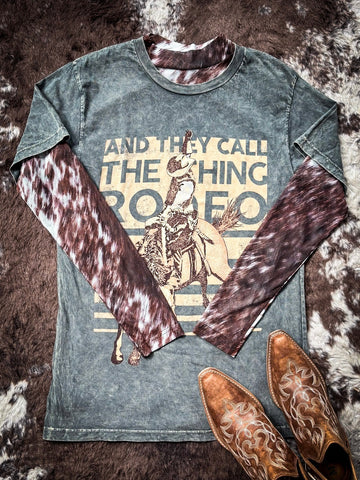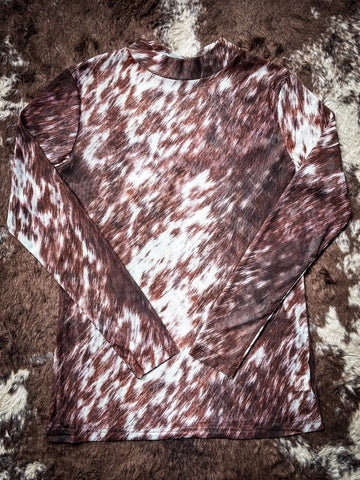 Embrace your inner cowgirl with the Up In Texas Top. This long sleeve mesh top features a unique cow hide print that's sure to turn heads. Lightweight and breathable, it's perfect for a day out in the sun (or at the rodeo). Yeehaw!