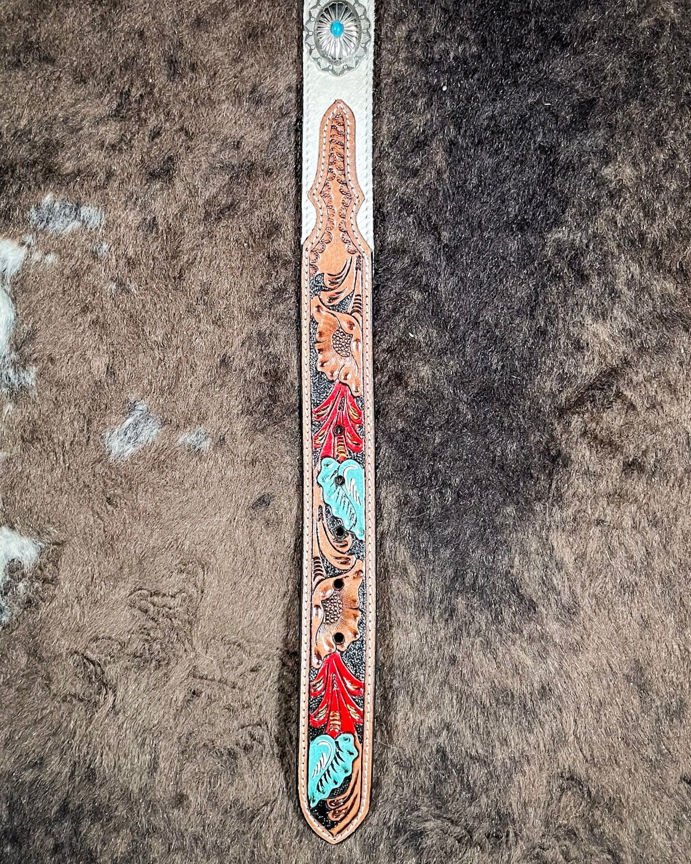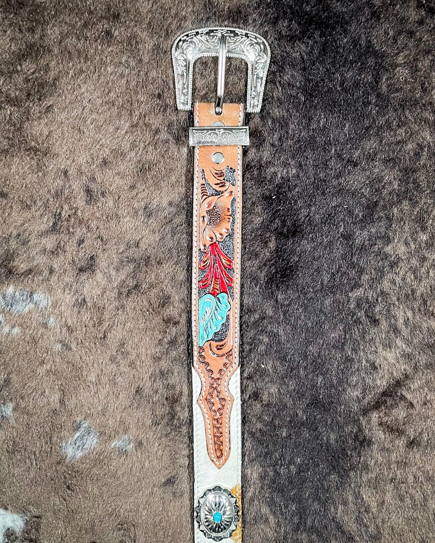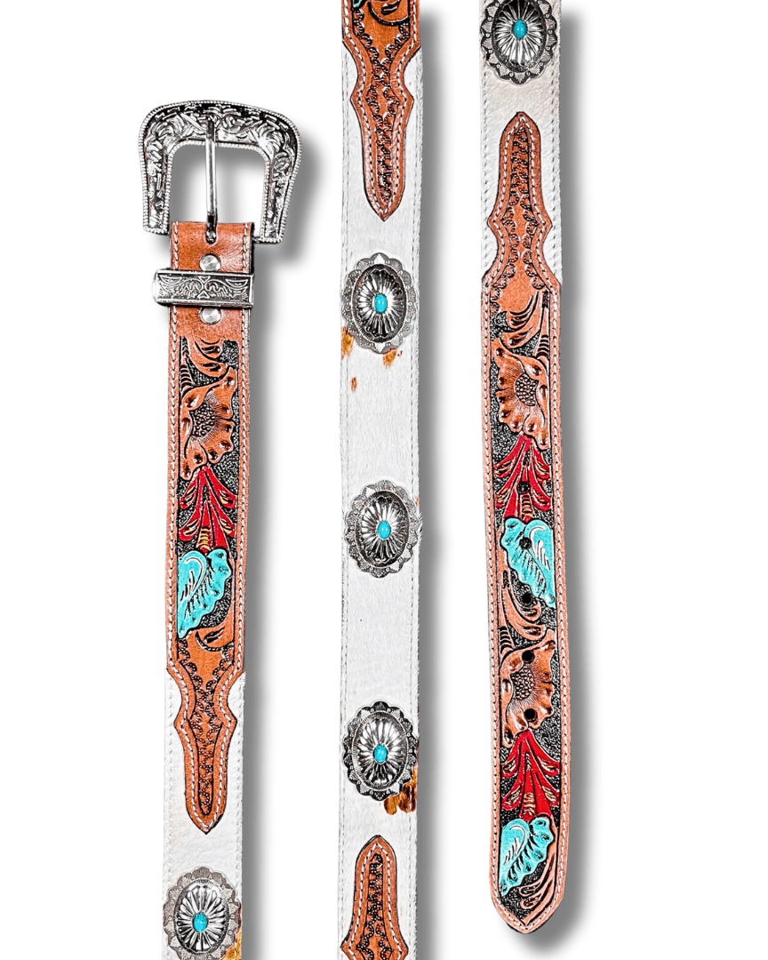 Add a touch of western elegance to your wardrobe with the Myra Bag - Cummerband Hand-Tooled Concho Belt. This exquisite accessory features intricate hand-tooled leather detailing, accented by bold conchos and complemented with luxurious hair-on-hide for a unique, textured finish. The craftsmanship and timeless charm make this belt a standout piece. Designed for versatility, it seamlessly enhances both casual and dressed-up outfits. Complete with a durable buckle for a secure fit, the Cummerband belt blends style, functionality, and rustic appeal, making it a must-have addition to any collection.